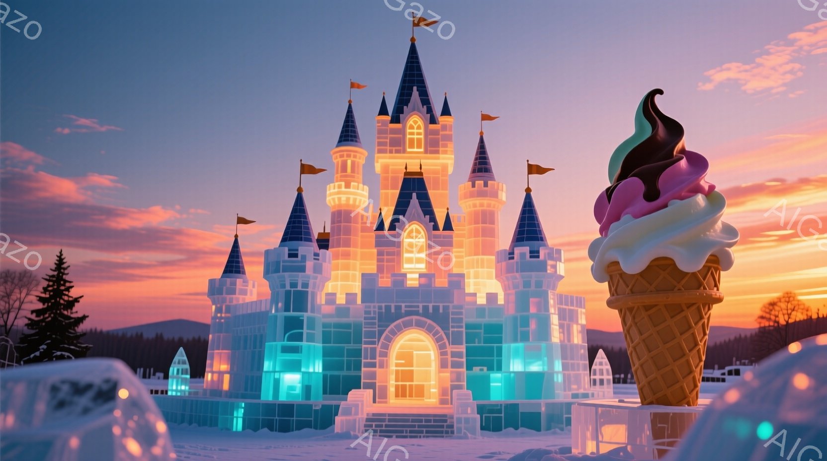 白く輝く氷の城が、夕焼け空の下にそびえ立っています。城の隣には巨大なソフトクリームの彫刻があり、ピンク、紫、緑の色合いが鮮やかです。雪に覆われた地面と遠くに見える木々が、冬の幻想的な雰囲気を醸し出しています。