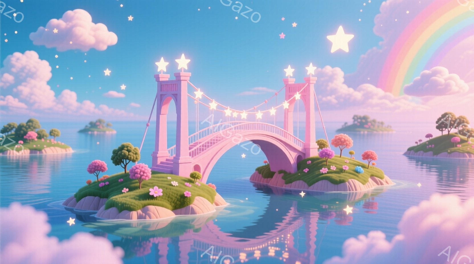 淡いピンク色のアーチ橋が、穏やかな水面をまたがって小さな島々を結んでいます。夜空には星が輝き、水面や島々には光る花々が咲き乱れ、夢のような幻想的な雰囲気を醸し出しています。明るい星や花々の光が水面に反射し、幻想的な光景を作り出しています。