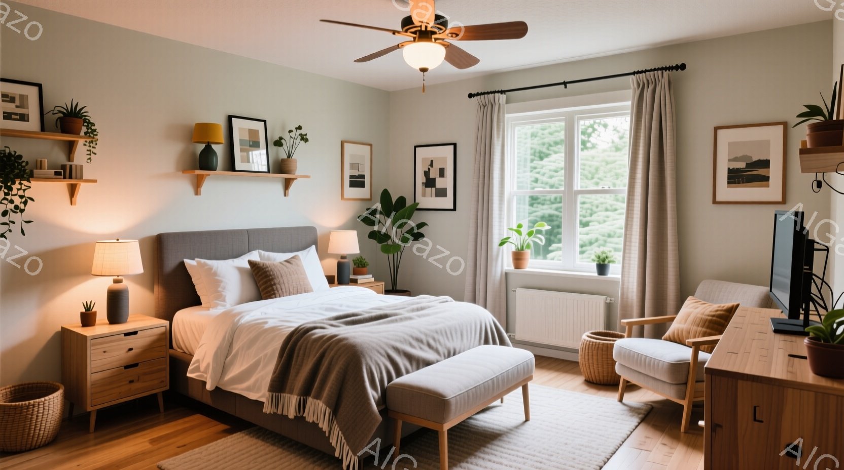 明るい日差しが差し込む寝室で、アースカラーを基調とした落ち着いた空間が広がっています。ベッドはオフホワイトのリネンで彩られ、テラコッタやオリーブグリーンのクッションがアクセントになっています。窓辺には観葉植物が置かれ、自然の温もりを感じさせる、リラックスできる雰囲気です。