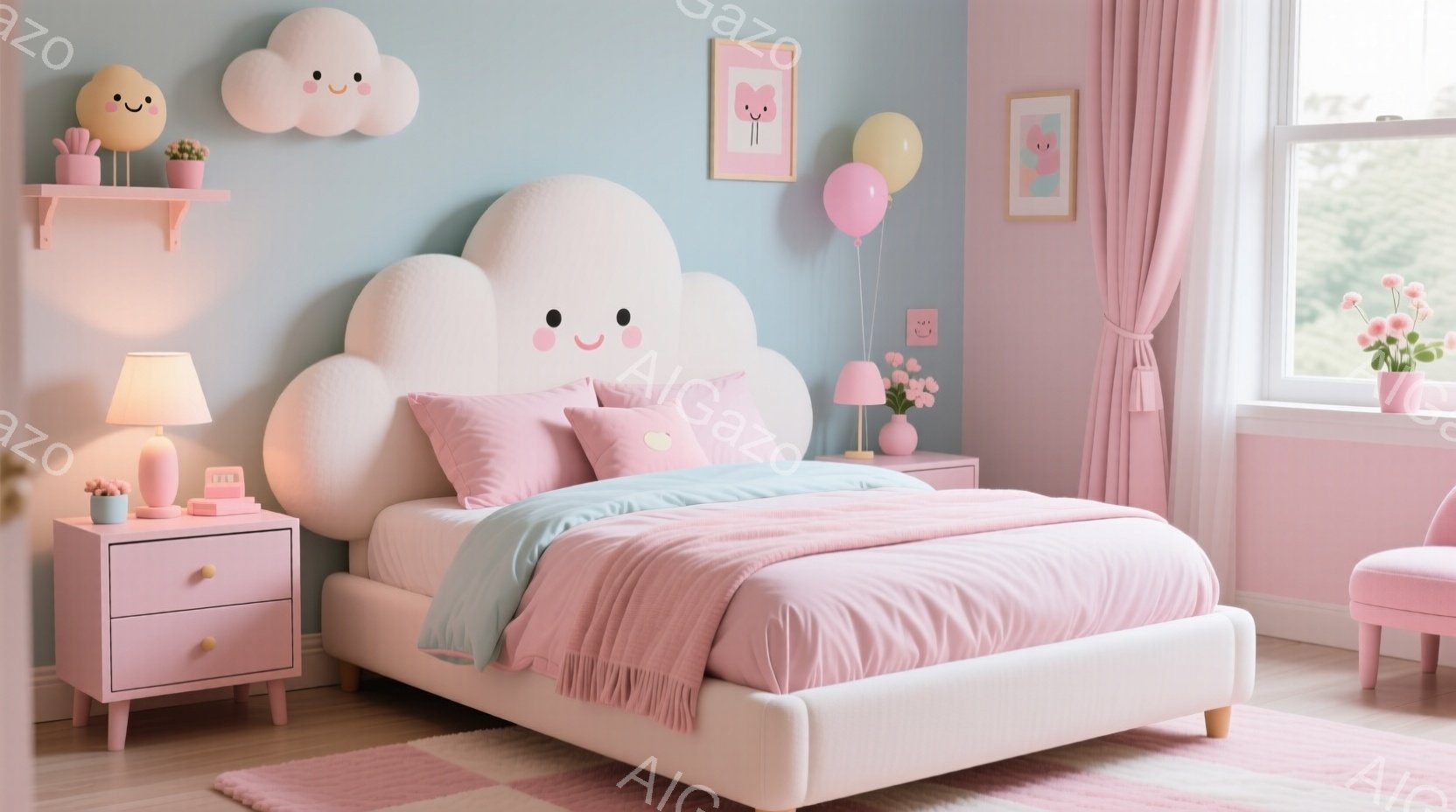 柔らかいピンク色のベッドルームで、雲の形をしたヘッドボードが特徴的です。部屋全体がパステルカラーで統一され、壁は水色、カーテンは濃いピンク色で、穏やかで可愛らしい雰囲気を醸し出しています。窓からは緑豊かな風景が見え、明るく心地よい空間を作り出しています。