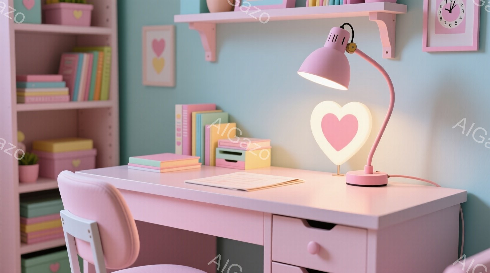 薄いピンク色の机の上に、様々な文房具や本が整然と並べられています。デスクライトはハート型で柔らかい光を放ち、淡い青色の壁が背景にあり、全体的に可愛らしく、落ち着いた雰囲気です。手前に置かれたノートとペンは、勉強や創作活動を促すように配置されています。