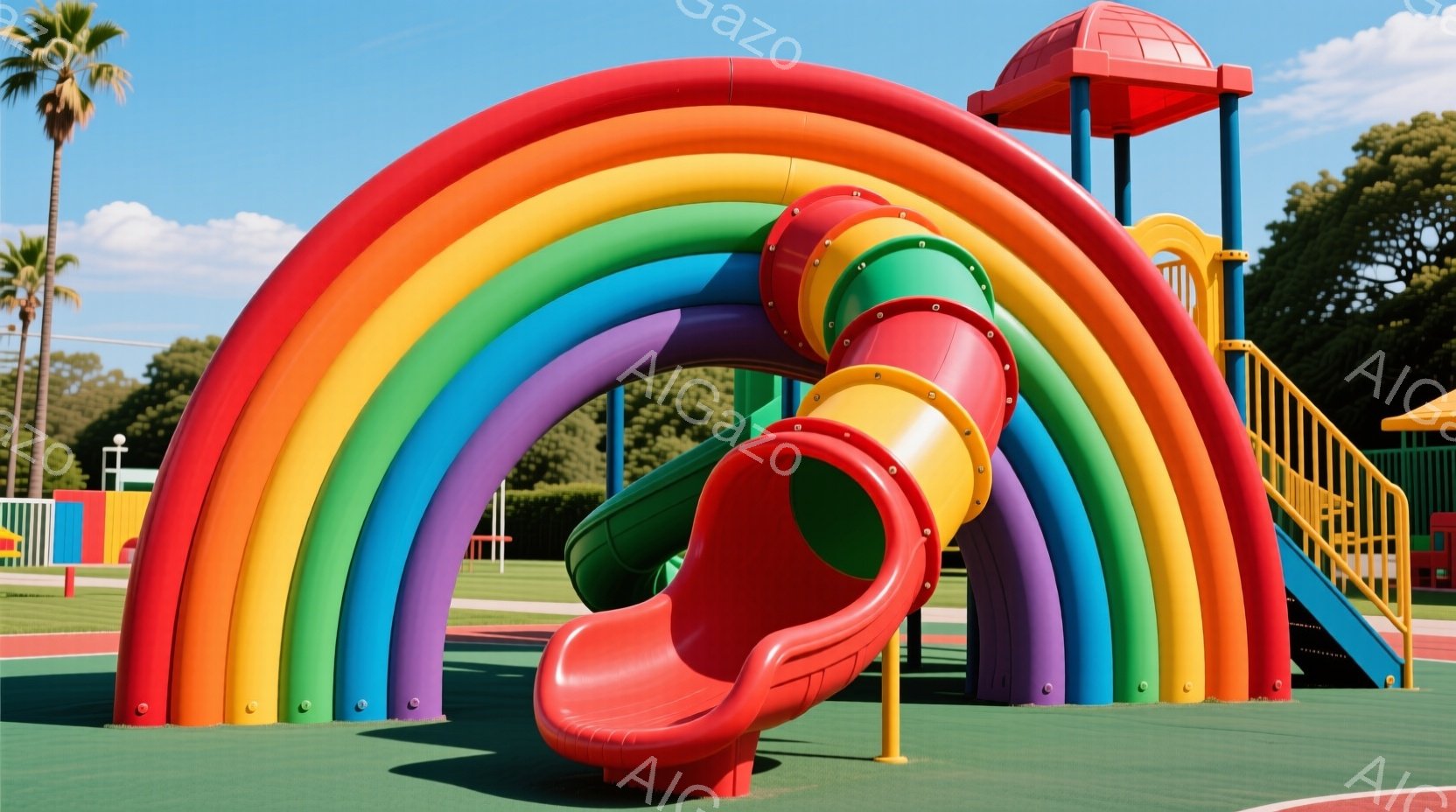 この無料AI生成画像「カラフルな虹色のアーチ状の遊具が、緑色のゴム製地面に設置されている公園の様子です。遊具は赤、橙、黄、緑、青、紫の色で構成され、滑り台が取り付けられています。背景には緑の芝生とフェンスが見え、晴天で遊ぶのに最適な日和の雰囲気です。」は、2025年10月23日に作成されました。 サイズは 1664×928px の高解像度で、商用利用も可能なフリー素材として提供しています。