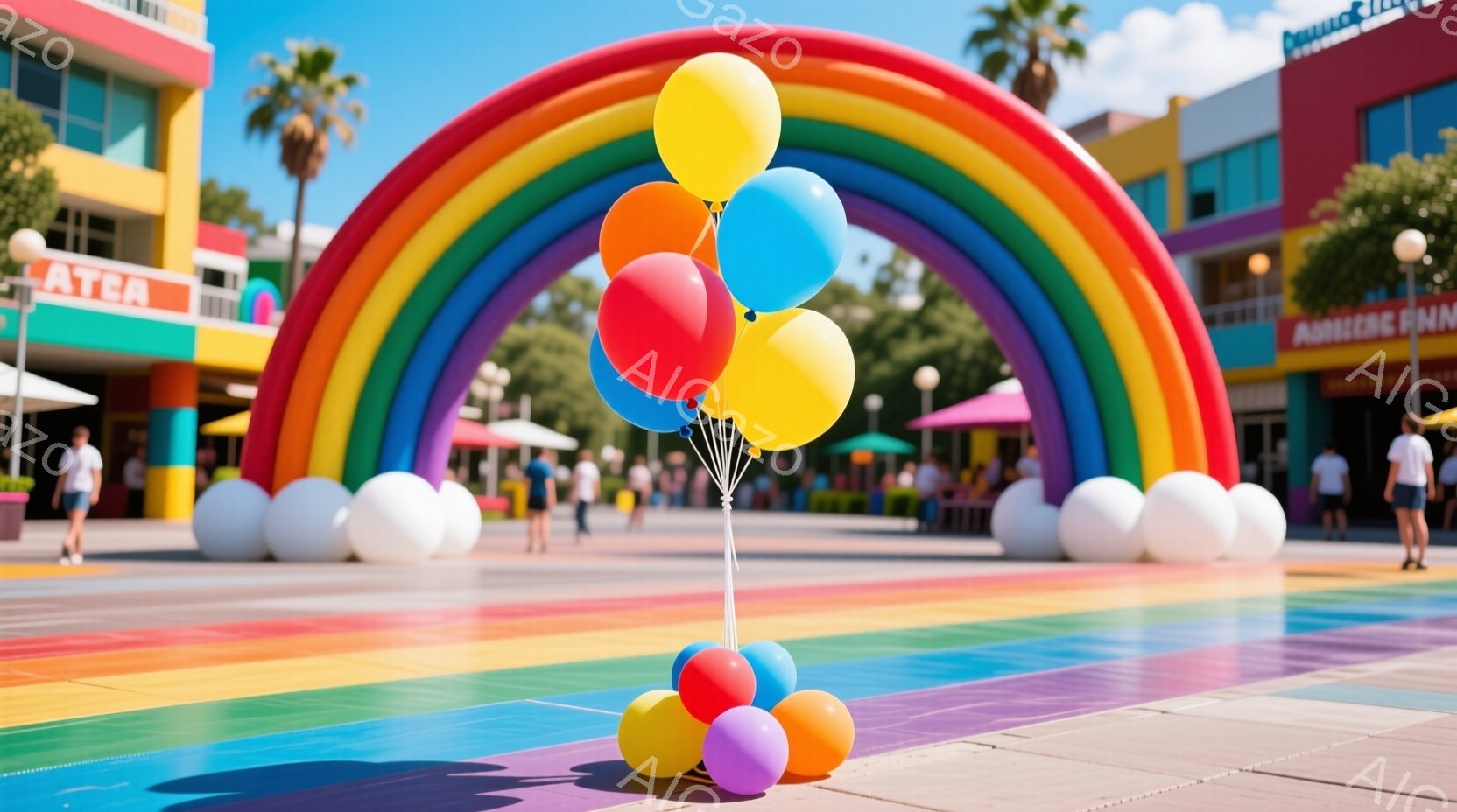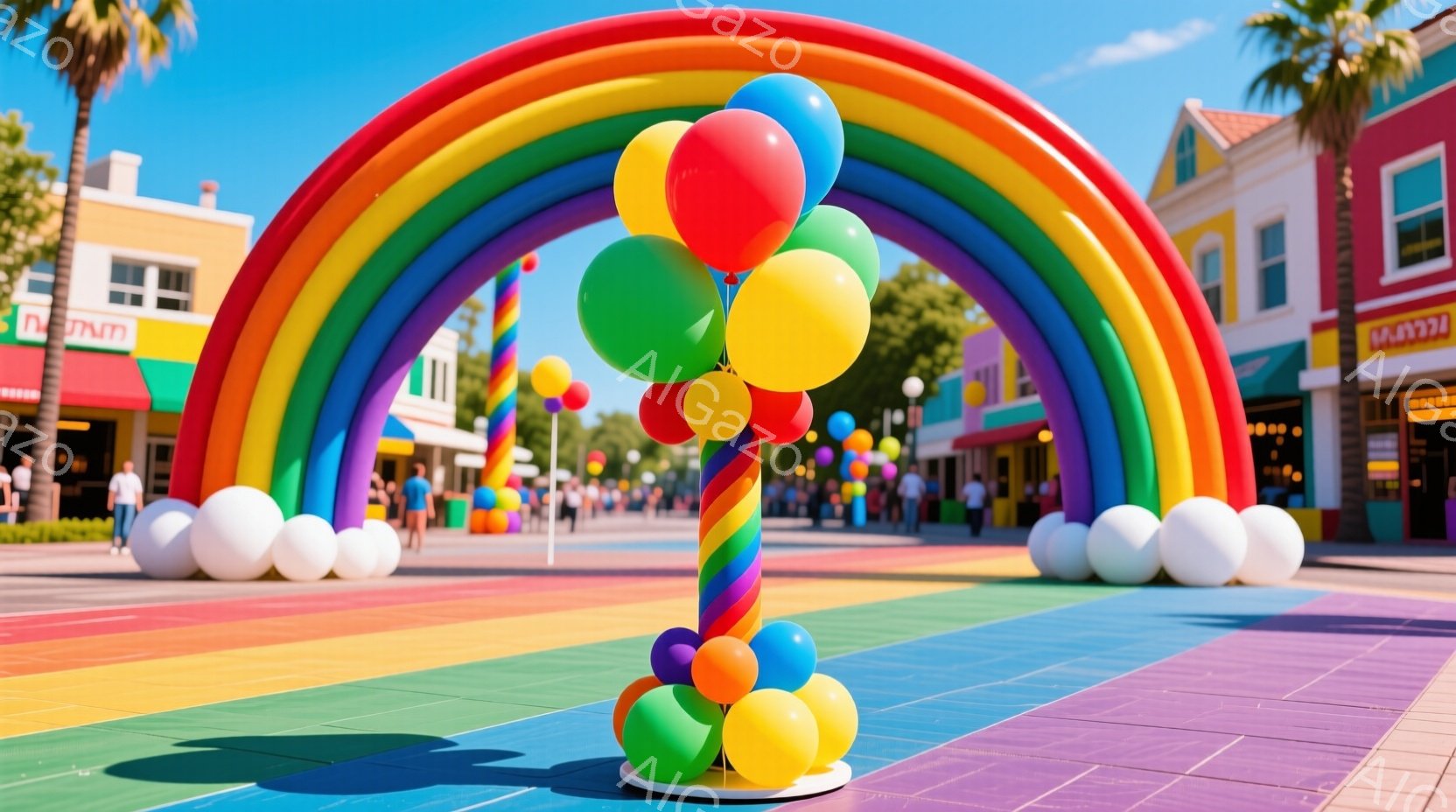 カラフルな虹のアーチが広場にそびえ立ち、その足元には様々な色の風船が飾られています。背景には、鮮やかな色彩の建物が並び、遠くにはヤシの木が見え、晴天の屋外であることがわかります。人々はカジュアルな服装で、楽しそうな雰囲気のイベントや装飾の一部であるように見えます。