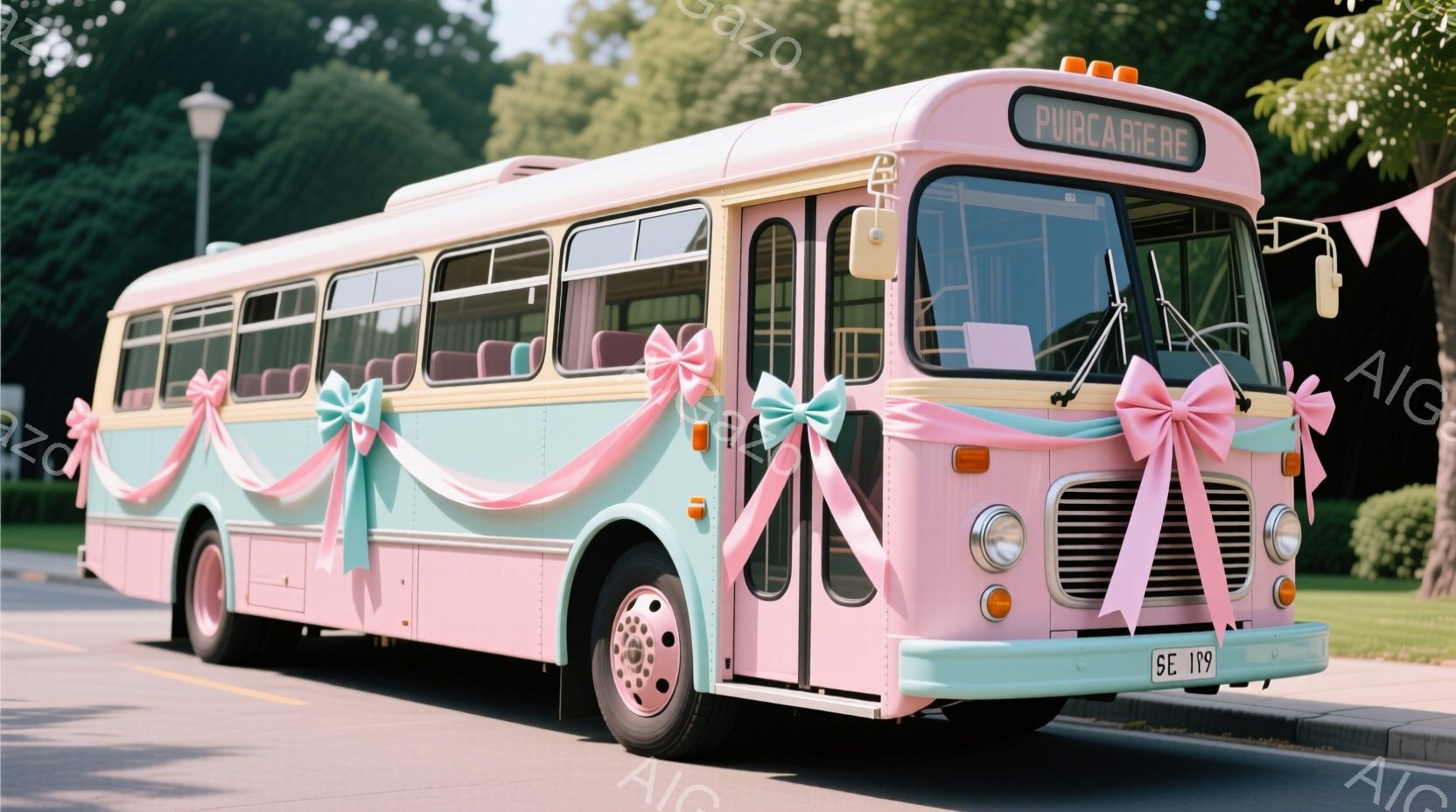 ピンク、水色、黄色で塗られたレトロなバスが道路脇に停まっています。装飾として、バスの前面にピンクと水色のリボンが結ばれており、特別なイベントで使用されているようです。背景には緑豊かな木々と晴れた空が広がり、暖かい雰囲気の画像です。