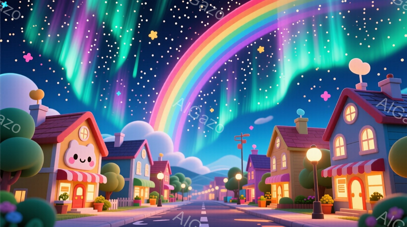 鮮やかな虹とオーロラが夜空を彩る、可愛らしい街並みです。中央には、ピンク色のクマのキャラクターが立っており、満面の笑みを浮かべています。建物はカラフルで丸みを帯びており、まるで絵本のような温かい雰囲気です。