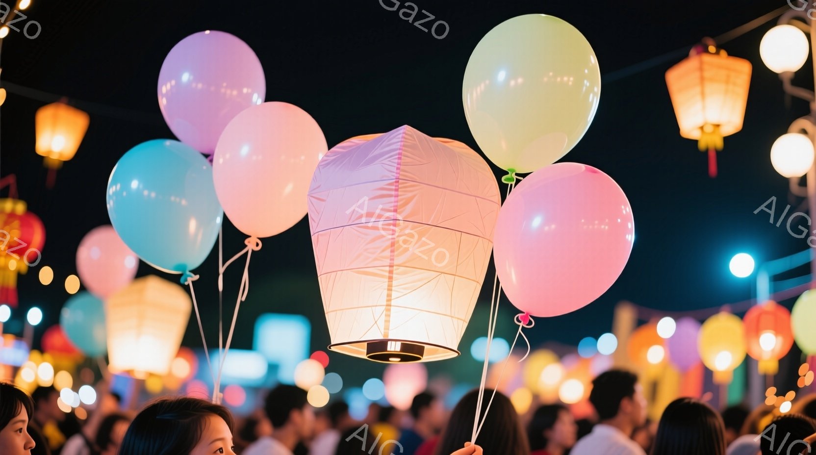夜空に色とりどりの提灯と風船が浮かび、祭りの賑わいを感じさせる光景です。人々は提灯と風船を手にしており、背景にはぼやけた人影と光が広がり、活気にあふれた雰囲気が伝わってきます。全体的に暖色系の光が優しく照らし、幻想的で温かい空間を作り出しています。