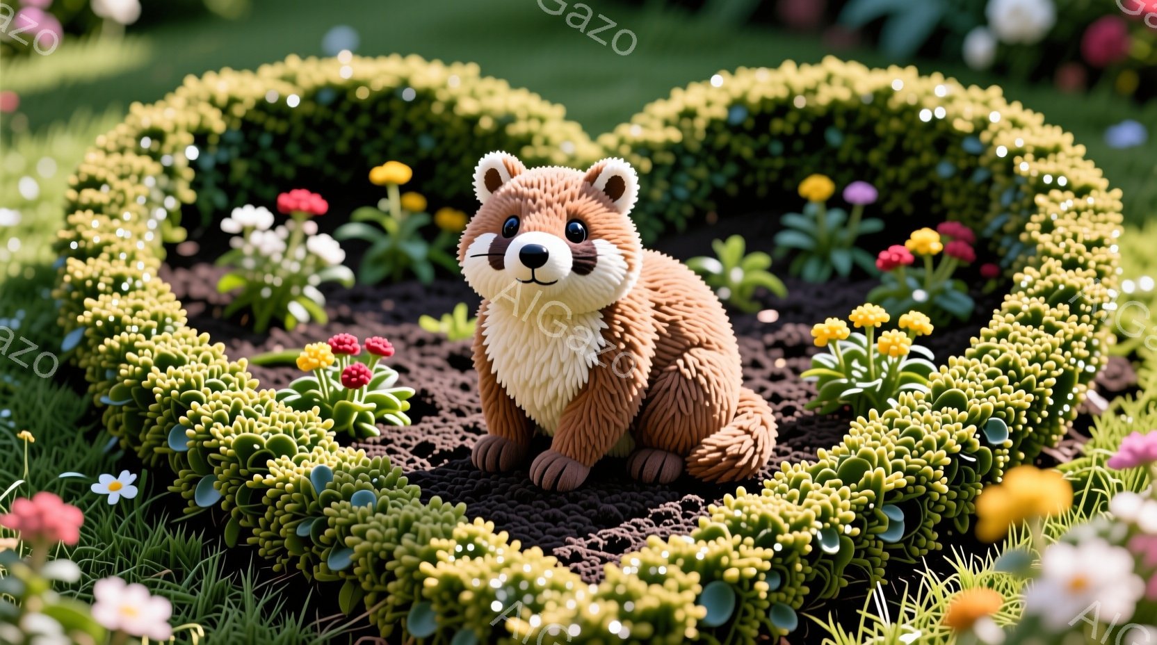 茶色いふわふわの動物の置物が、緑豊かな花壇の中心に立っている。その動物はつぶらな瞳と愛らしい笑顔を持ち、小さく丸い土台の上に立っている。背景には、様々な色の花が咲き乱れ、鮮やかな緑の植物が生い茂り、全体的に暖かく可愛らしい雰囲気を醸し出している。