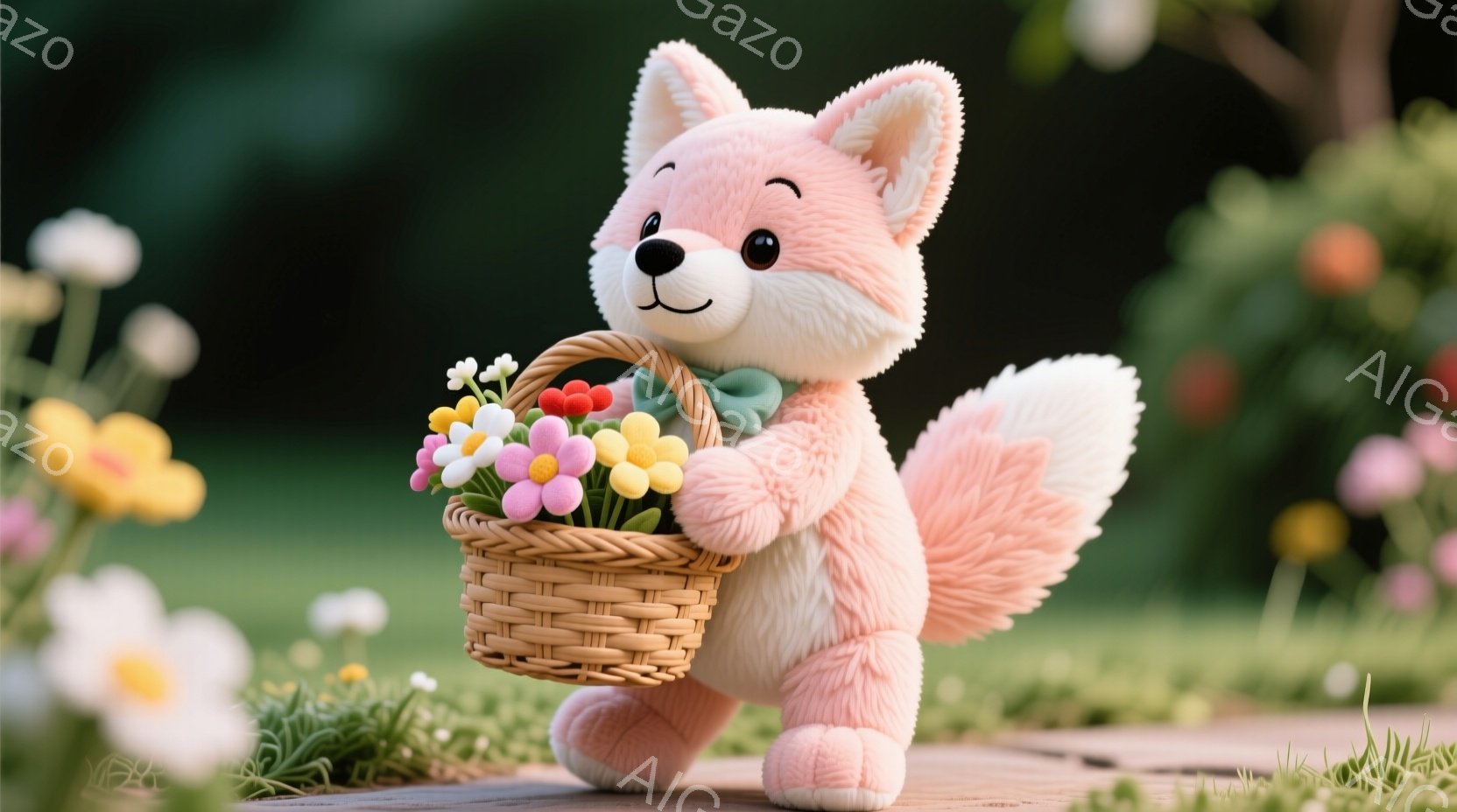 ふわふわのピンク色の狐が、紫色のズボンを履き、緑色のリボンを首に巻いています。その狐は、たくさんのカラフルな花が入ったバスケットを抱え、嬉しそうな表情で正面を見つめています。背景には、さまざまな色の花が咲き乱れる緑の草原が広がり、穏やかで可愛らしい雰囲気を醸し出しています。