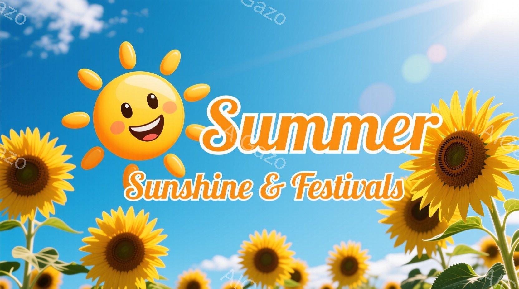 鮮やかな色のパラソルが並び、お祭りの賑やかな雰囲気を表している。背景にはヤシの木が見え、晴れた青空が広がっており、夏らしさを強調している。全体的に明るく楽しい雰囲気が漂い、活気のあるお祭りの様子が想像できる。