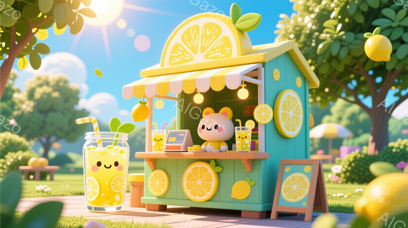 明るい緑色のレモンをモチーフにした屋台が描かれています。レモンのキャラクターが屋台の中で微笑んでおり、レモンジュースが並んでいます。背景には緑豊かな木々と青空が広がり、暖かい夏の日の雰囲気が漂っています。