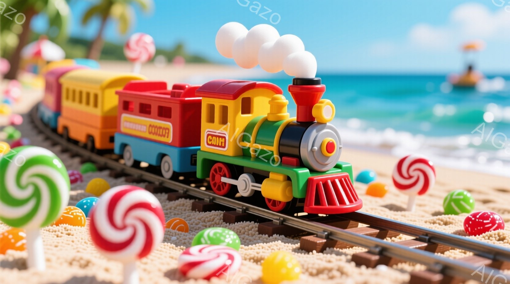 カラフルなキャンディで飾られた砂浜に、おもちゃの列車が走っている様子が描かれています。列車は赤、緑、黄色、オレンジの車輪が付いた可愛らしいデザインで、煙突からは白い蒸気が立ち上っています。背景には青い海とヤシの木が見え、明るく楽しい雰囲気を醸し出しています。