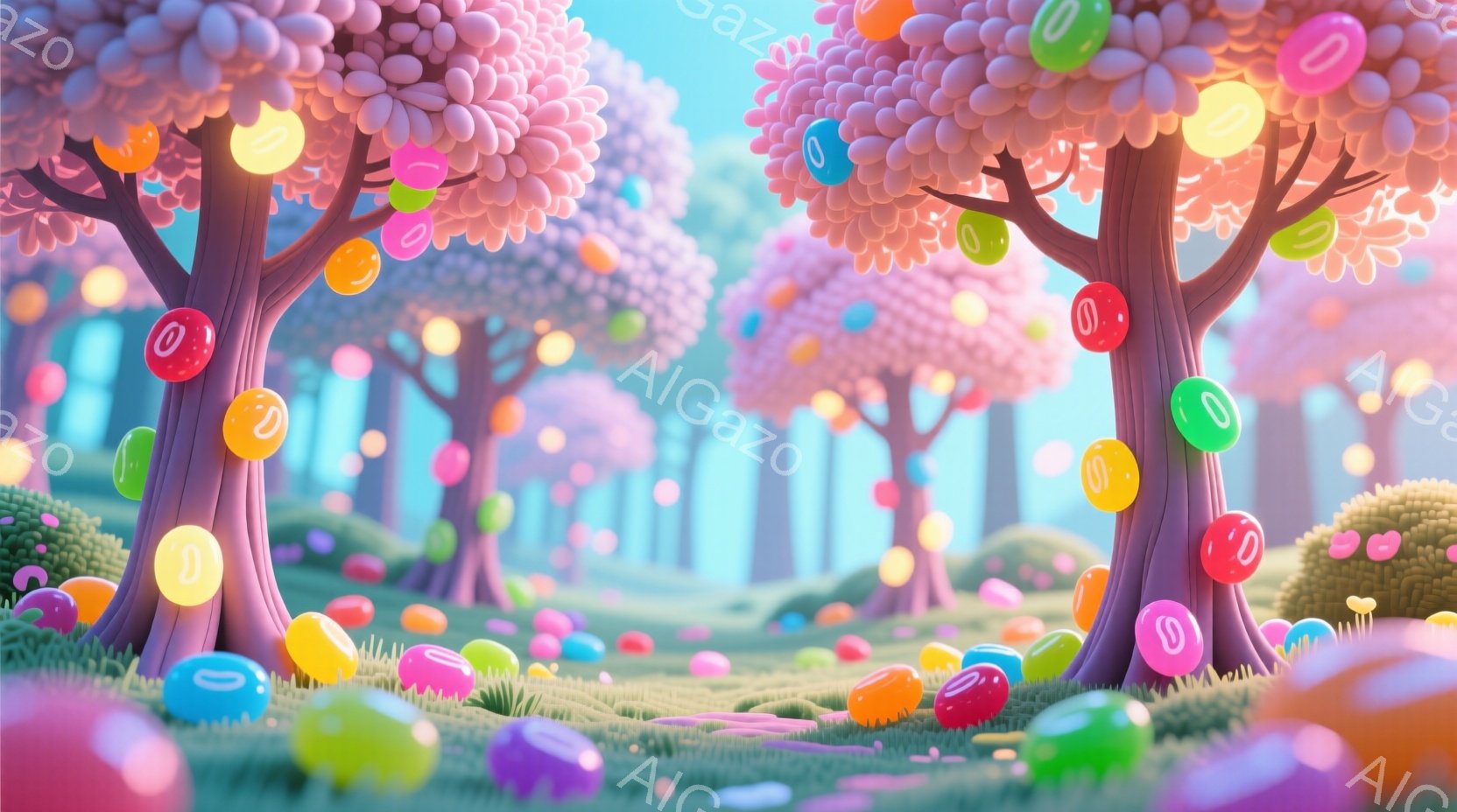 カラフルなキャンディーで覆われた奇妙な森が描かれている。木々はキャンディーのような丸い葉を持ち、地面には様々な色のキャンディーが散らばっている。全体的に夢のような、おとぎ話のような雰囲気が漂っている。