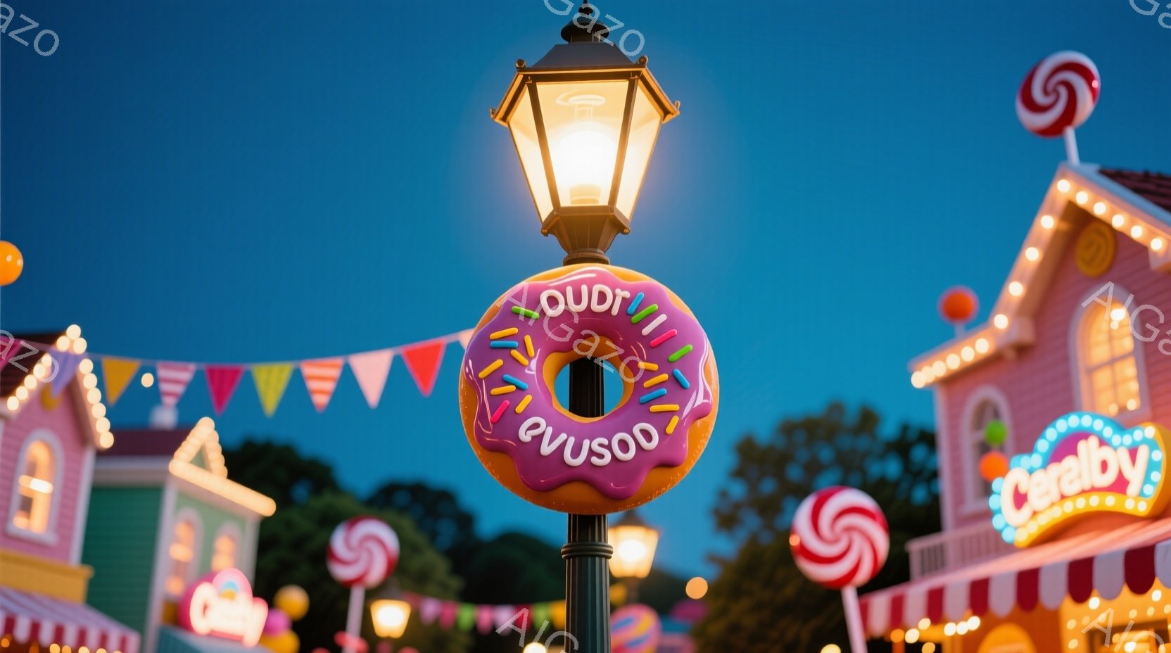 この無料AI生成画像「This image captures a quaint, fairy-tale village at night. The central focus is a large, colorful donut sign that stands out against the dark sky and illuminated surroundings. It reads "DANTE," which could be an alias or a character's name, indicating some level of playfulness or fantasy theme within this setting. Around the donut sign, there are smaller banners and flags that add to the festive atmosphere. The buildings in the background have a classic European architecture style with pointed roofs and facades decorated in pastel colors, contributing to an overall whimsical ambiance. There is a lone figure near the donut sign, adding a human element to the scene. However, their features are not clearly visible due to the image's size, so detailed descriptions of their clothing, hairstyle, or expression cannot be provided. The person seems relaxed and casual, which complements the laid-back vibe of this charming village.」は、2025年10月23日に作成されました。 サイズは 1664×928px の高解像度で、商用利用も可能なフリー素材として提供しています。