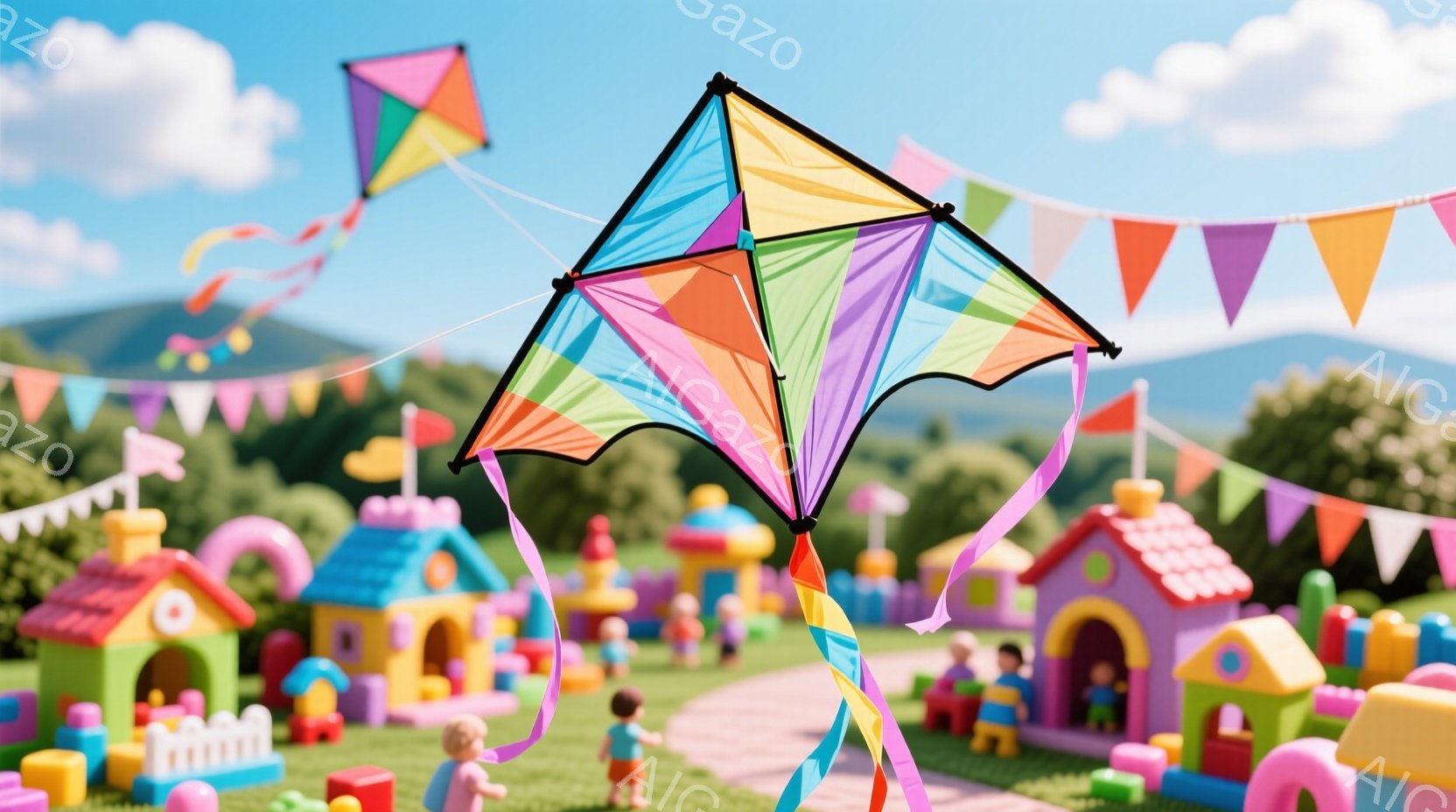 カラフルな凧が青空に舞い上がっており、ピンク、紫、緑、オレンジ、黄色のストライプが特徴的です。背景には、ピンク色の道に囲まれた、おもちゃのようなカラフルな建物が並び、緑豊かな芝生と木々が広がっています。全体的に明るく、遊び心溢れる、楽しい雰囲気が漂っています。