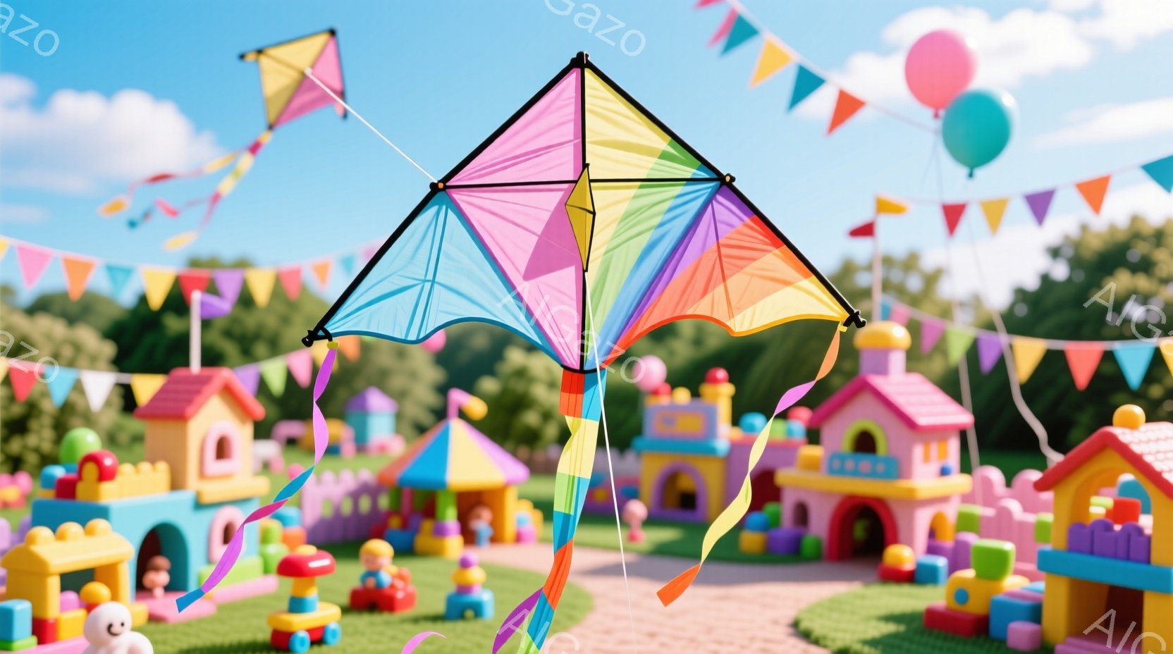カラフルな凧が青空に舞い上がっており、背景にはおもちゃのようなカラフルな家々が並んでいます。小さな子供たちが庭で遊んでおり、皆明るい表情で楽しんでいます。全体的に、晴れた日のおもちゃの国のような、夢のある雰囲気です。