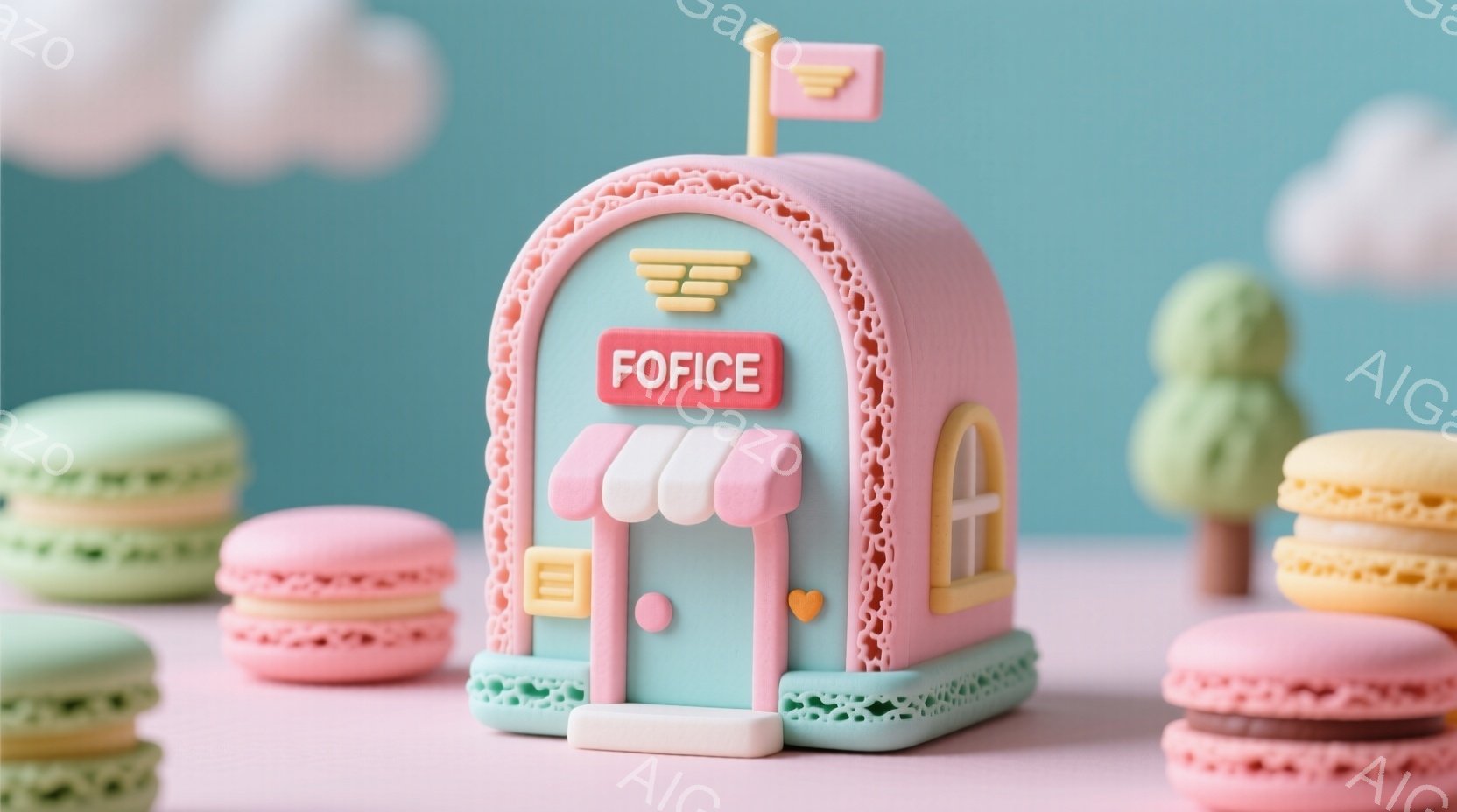 パステルグリーンの小さな家が、ピンク色のアクセントで可愛らしく飾られています。家の屋根には繊細なレース模様が施され、入り口には黄色いドアノブが付いています。背景にはマカロンが配置され、明るく優しい雰囲気を醸し出しています。
