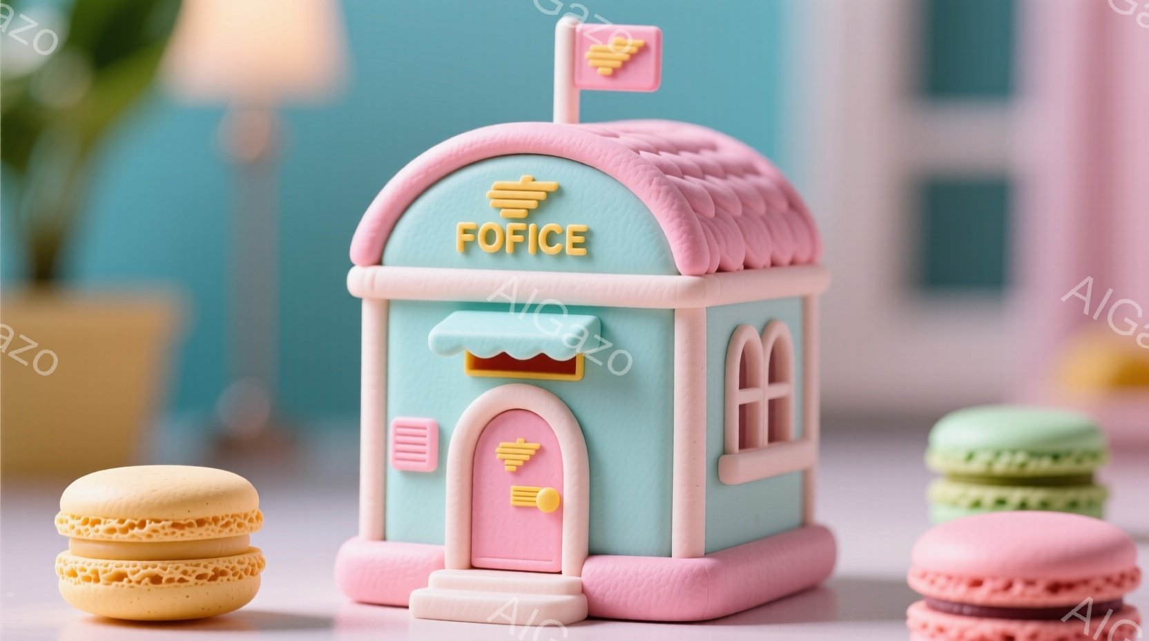 パステルカラーのマカロン風の可愛らしい家が中央に配置され、クリーム色とピンク色のマカロンが周囲を彩っています。家には「OFFICE」と書かれた看板があり、小さな窓と入り口には花が飾られています。背景は淡い水色で、全体的に甘くて夢のような雰囲気を醸し出しています。