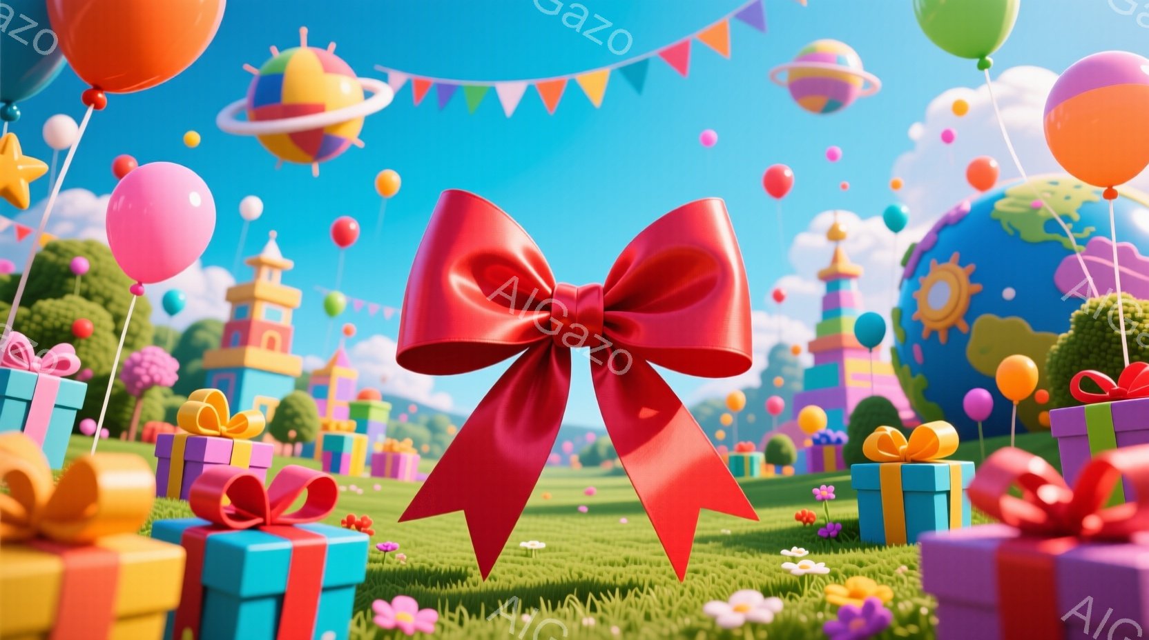 この無料AI生成画像「鮮やかな緑色のプレゼントボックスが中央に大きく配置され、大きな赤いリボンが飾られています。背景には、カラフルな風船やプレゼントの山、そして地球儀のような建造物が並ぶ緑の丘が広がっており、明るい晴天の下、お祝いの雰囲気が漂います。全体的にパステルカラーで統一されており、お祭りや誕生日パーティーのような、喜びと楽しさが感じられるイラストです。」は、2025年10月23日に作成されました。 サイズは 1664×928px の高解像度で、商用利用も可能なフリー素材として提供しています。