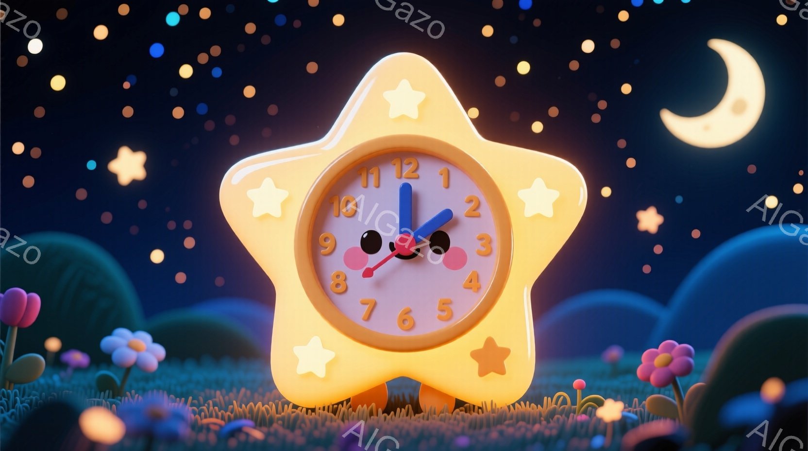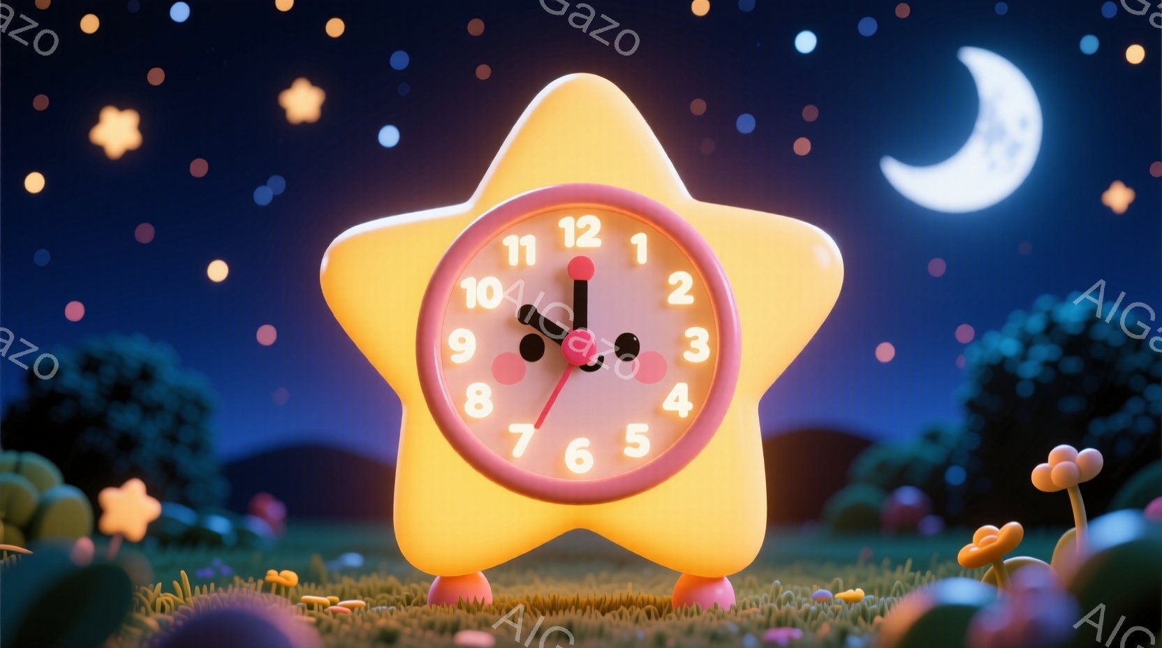 星型の時計が、緑の芝生の上に立っている可愛らしい光景です。時計は明るい黄色で、愛らしい笑顔と大きな目を持っています。背景には、パステルカラーの丘と、夜空に輝く星と三日月があり、夢のような雰囲気を醸し出しています。