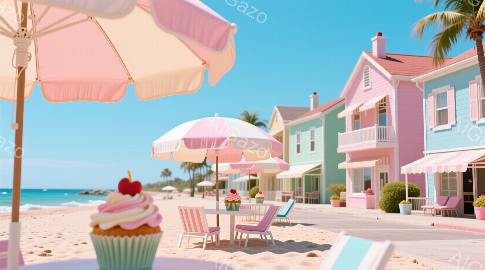 砂浜にピンクと白のストライプのパラソルと、クリームとイチゴが飾られたカップケーキが置かれたテーブルが並んでいます。背景にはパステルカラーの可愛らしい家々が立ち並び、青い海とヤシの木が夏の穏やかな雰囲気を醸し出しています。全体的に、夢のような甘くて平和な光景です。