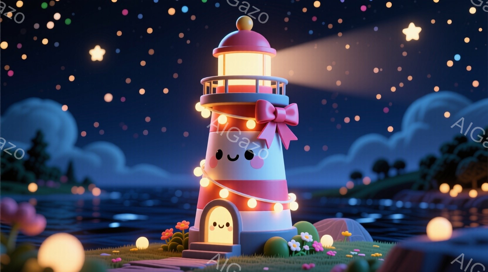 優しい夜空を背景に、可愛らしい灯台が立っている。灯台はピンクと白のストライプで、リボンと小さなドアが特徴的で、まるで生きているかのような愛らしい表情をしている。背景には穏やかな海と、きらめく星空が広がり、暖かい雰囲気を作り出している。