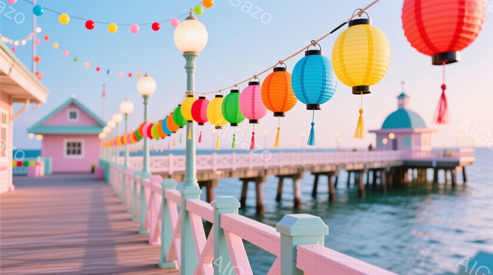 ピンク色の桟橋には、色とりどりの提灯が飾られ、明るい日差しの中で穏やかな海が広がっています。桟橋の上には数人の人々が歩いており、リラックスした雰囲気の中で景色を楽しんでいるようです。背景には、ピンク色の建物と青い空が広がり、全体的に温かく、のどかな印象を与えます。
