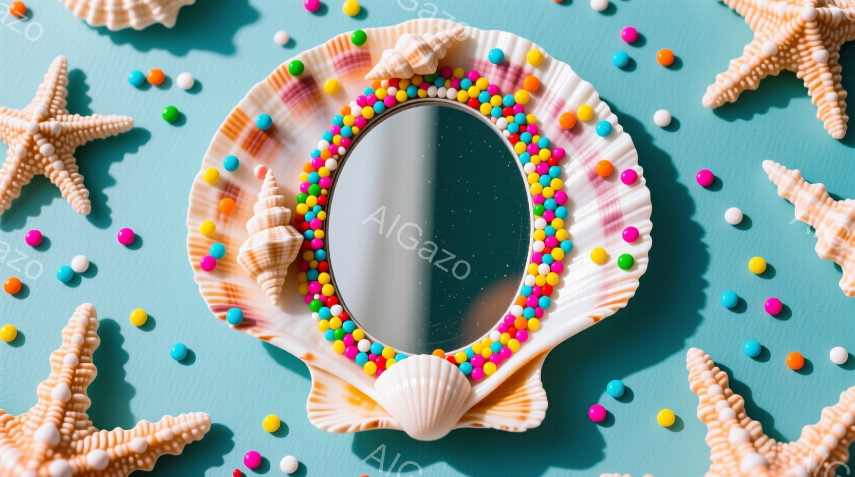 明るいターコイズブルーの背景に、貝殻で作られたフレームが配置されています。フレームは、さまざまな色の小さなビーズで縁取られており、中央には青空が映っています。周りには、貝殻やビーズが散りばめられており、夏らしい、リラックスした雰囲気を作り出しています。