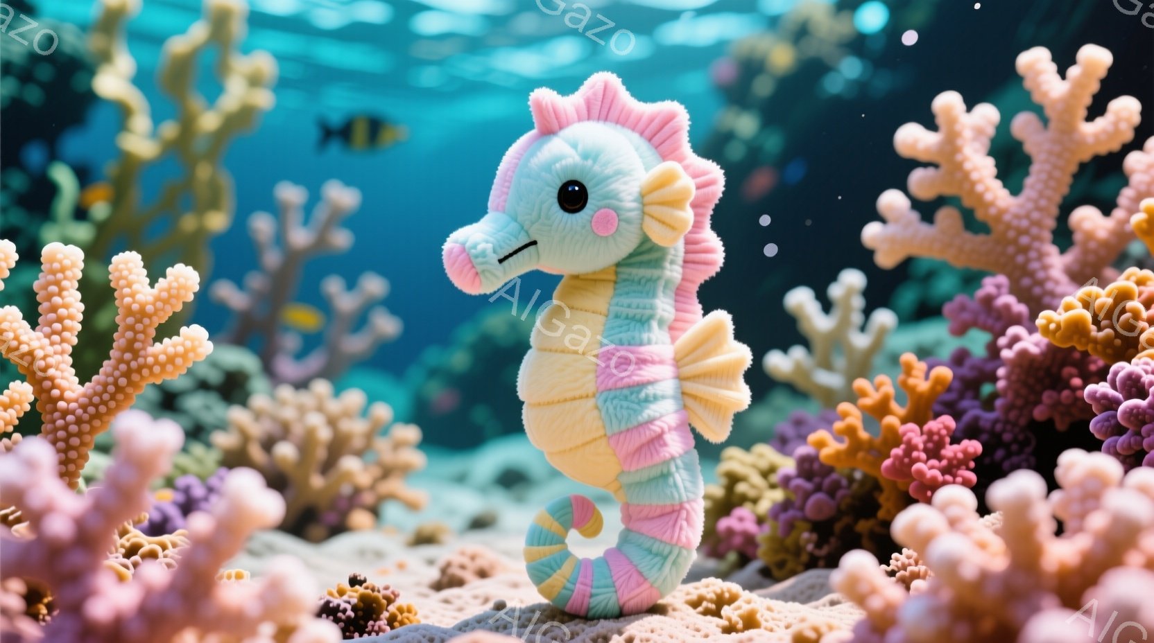 この無料AI生成画像「鮮やかなピンクと黄色のストライプが特徴的な、かわいらしいセーホース(タツノオトシゴ)が画面中央に配置されています。セーホースは、ピンク、青、黄色、紫のストライプ模様の体で、まるでぬいぐるみのように柔らかい印象を与えます。背景には、ピンクやオレンジ色のサンゴ礁が密集しており、まるで水中庭園のような幻想的な雰囲気を醸し出しています。」は、2025年10月23日に作成されました。 サイズは 1664×928px の高解像度で、商用利用も可能なフリー素材として提供しています。
