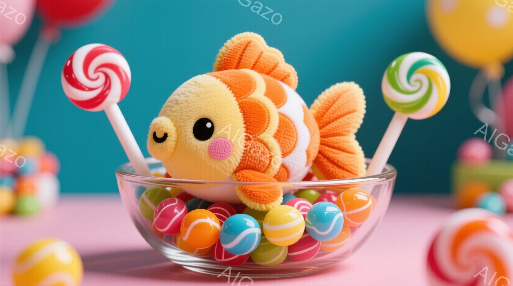 ふわふわのオレンジ色の金魚が、カラフルなキャンディーで満たされたガラスのボウルの中にいます。金魚は愛らしい表情で、まるでキャンディーの海で楽しく過ごしているかのようです。背景はパステルピンクのテーブルで、全体的に甘くて幸せな雰囲気を醸し出しています。