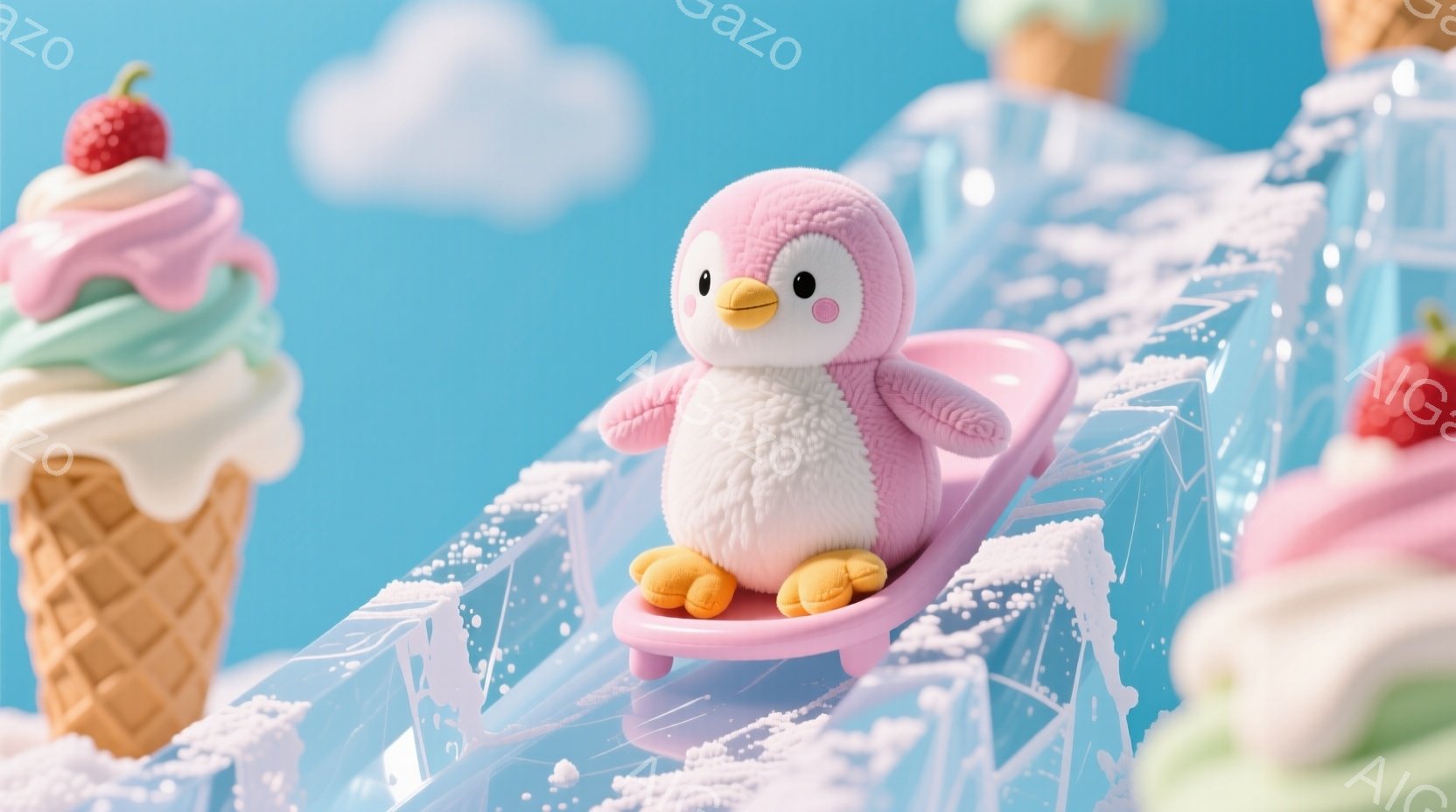 鮮やかなピンク色の背景に、可愛らしいペンギンのぬいぐるみがおもちゃのそりに乗って滑っています。周囲にはアイスクリームのコーンが配置され、雪のような白い装飾が全体を覆い、冬の楽しい雰囲気を醸し出しています。ペンギンは嬉しそうな表情で、雪遊びを楽しんでいる様子が伝わってきます。