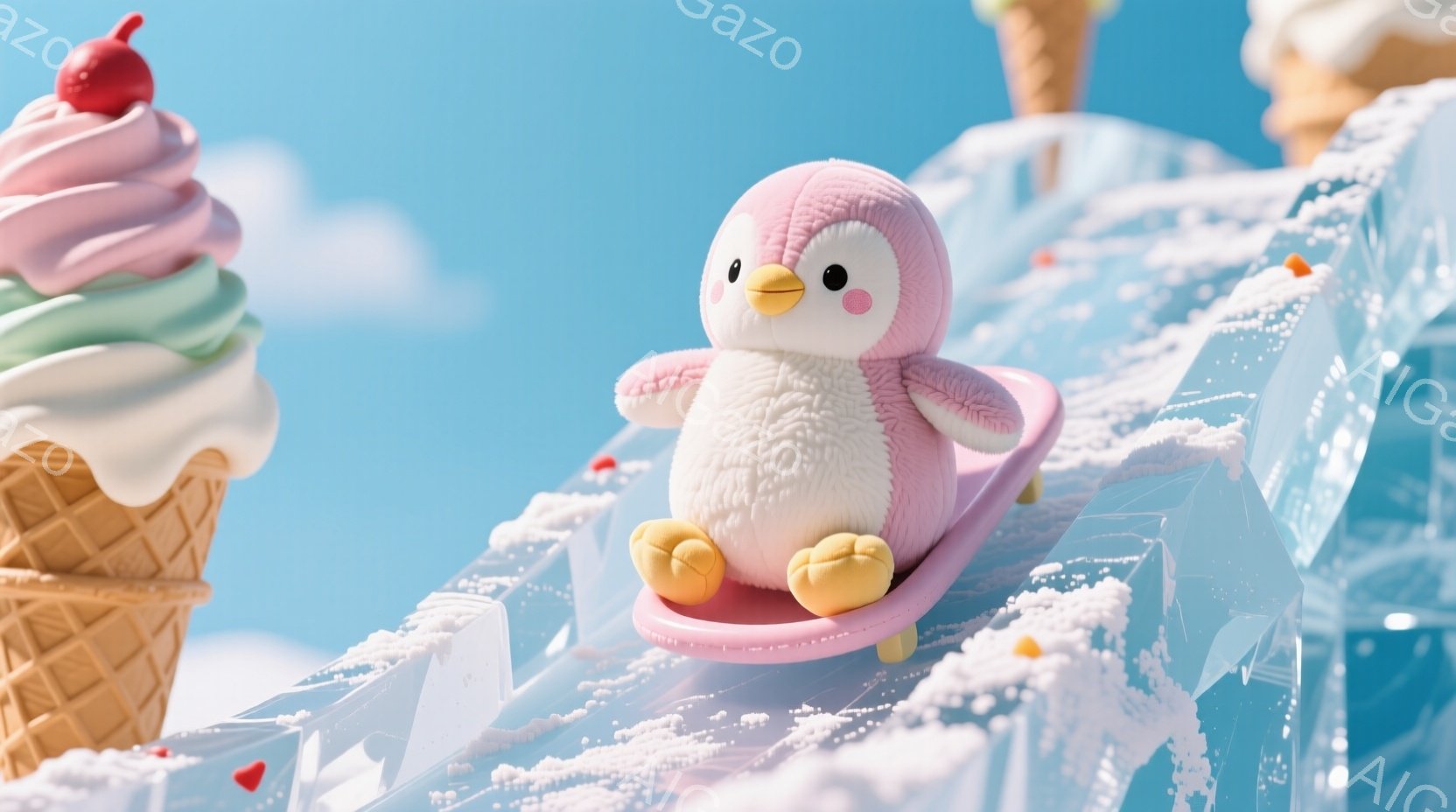 ふわふわのペンギンがピンク色のソリに乗って滑っている様子が描かれています。背景にはソフトクリームの山々と氷の彫刻があり、雪が舞っているかのような白い粒子が散りばめられています。全体的にパステルカラーで、可愛らしく夢幻的な雰囲気が漂っています。