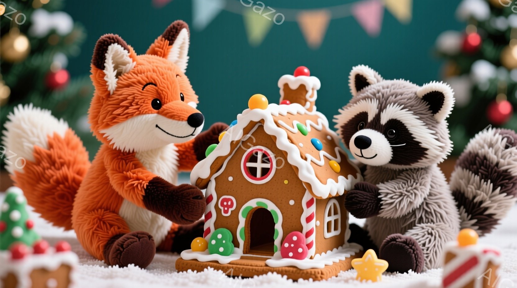 オレンジ色の毛並みのキツネと、灰色の毛並みのタヌキが、ジンジャーブレッドハウスの前に立っています。キツネは右手を伸ばし、タヌキは左手を伸ばして、まるでジンジャーブレッドハウスを一緒に飾ろうとしているかのようです。背景にはクリスマスツリーやプレゼント、光がちらつく装飾があり、全体的に暖かく、お祝いムードに満ちた雰囲気です。