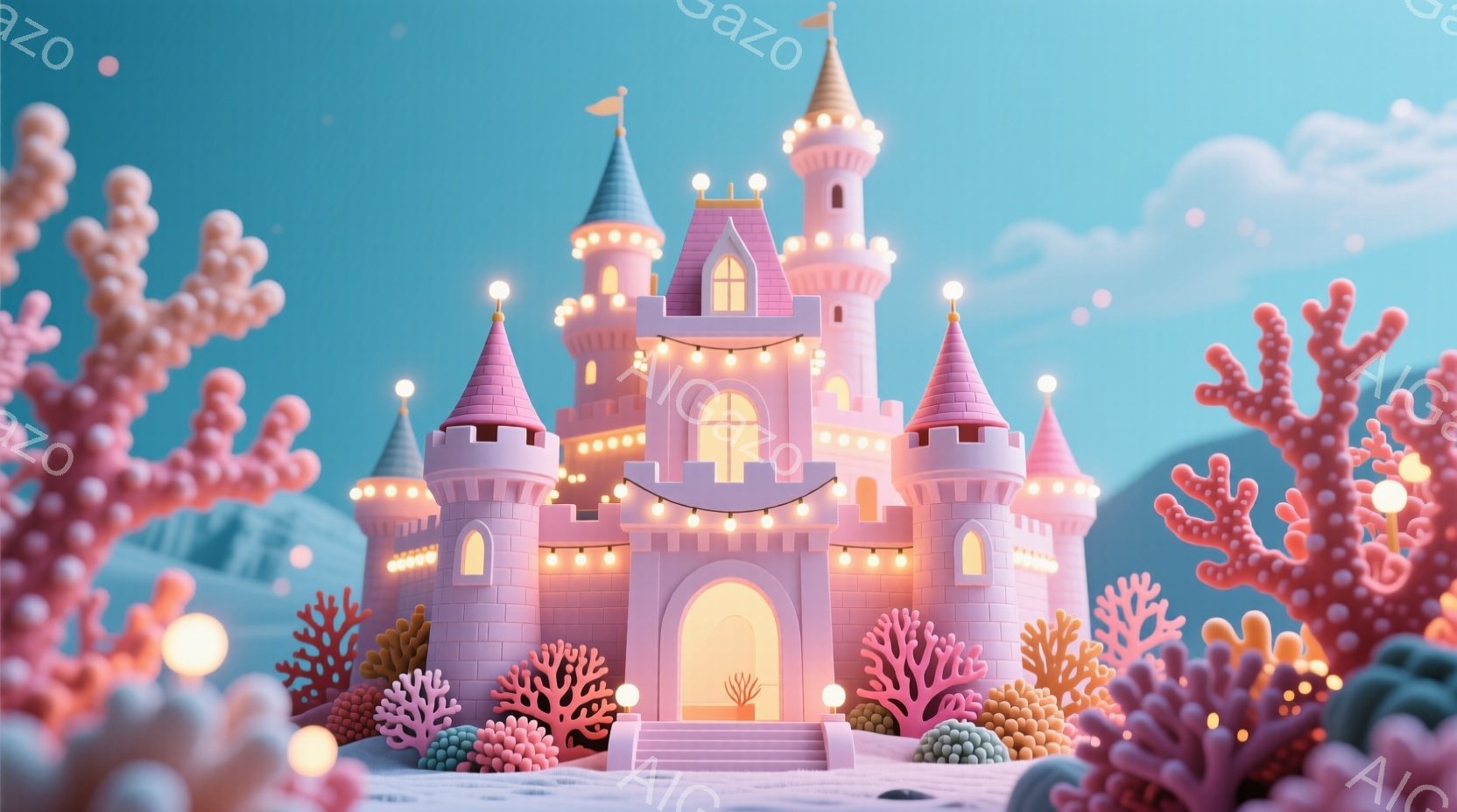 海底都市が描かれており、独特な形の建物が密集して並んでいる。建物は暗い色調で、貝殻や海藻で装飾されており、窓からは暖かい光が漏れている。背景にはサンゴ礁や海藻が茂り、水面からは光が差し込み、幻想的な雰囲気を醸し出している。
