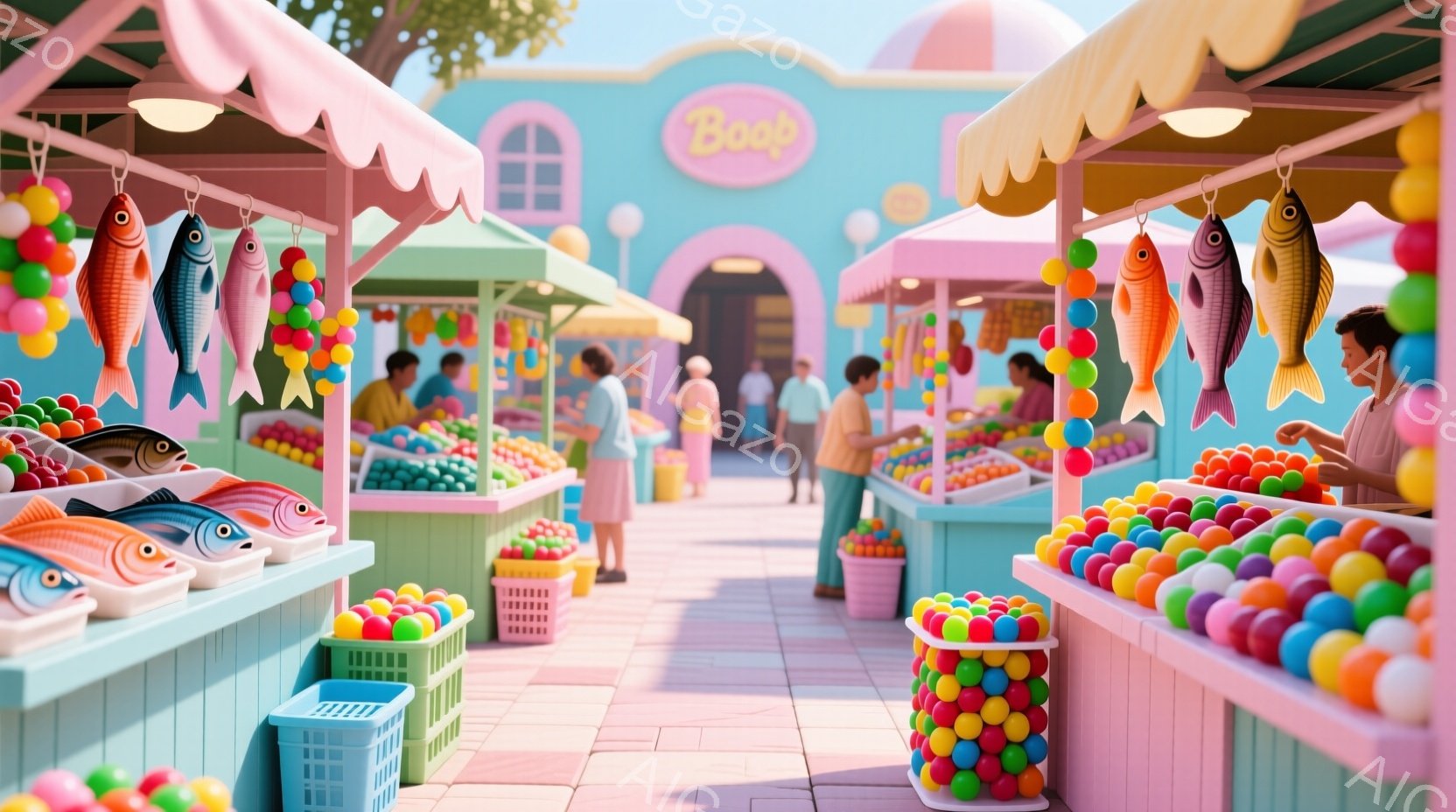 鮮やかな色彩の屋台が並ぶ祭りの風景で、ピンクや水色のストライプ柄の屋根が印象的です。人々はカラフルな金魚すくいの屋台を取り囲み、楽しんでいる様子で、特に一人の女性は屋台の前に立ち、金魚すくいの道具を手にしています。背景には建物や緑が見え、晴天の下、賑やかなお祭りの雰囲気が伝わってきます。