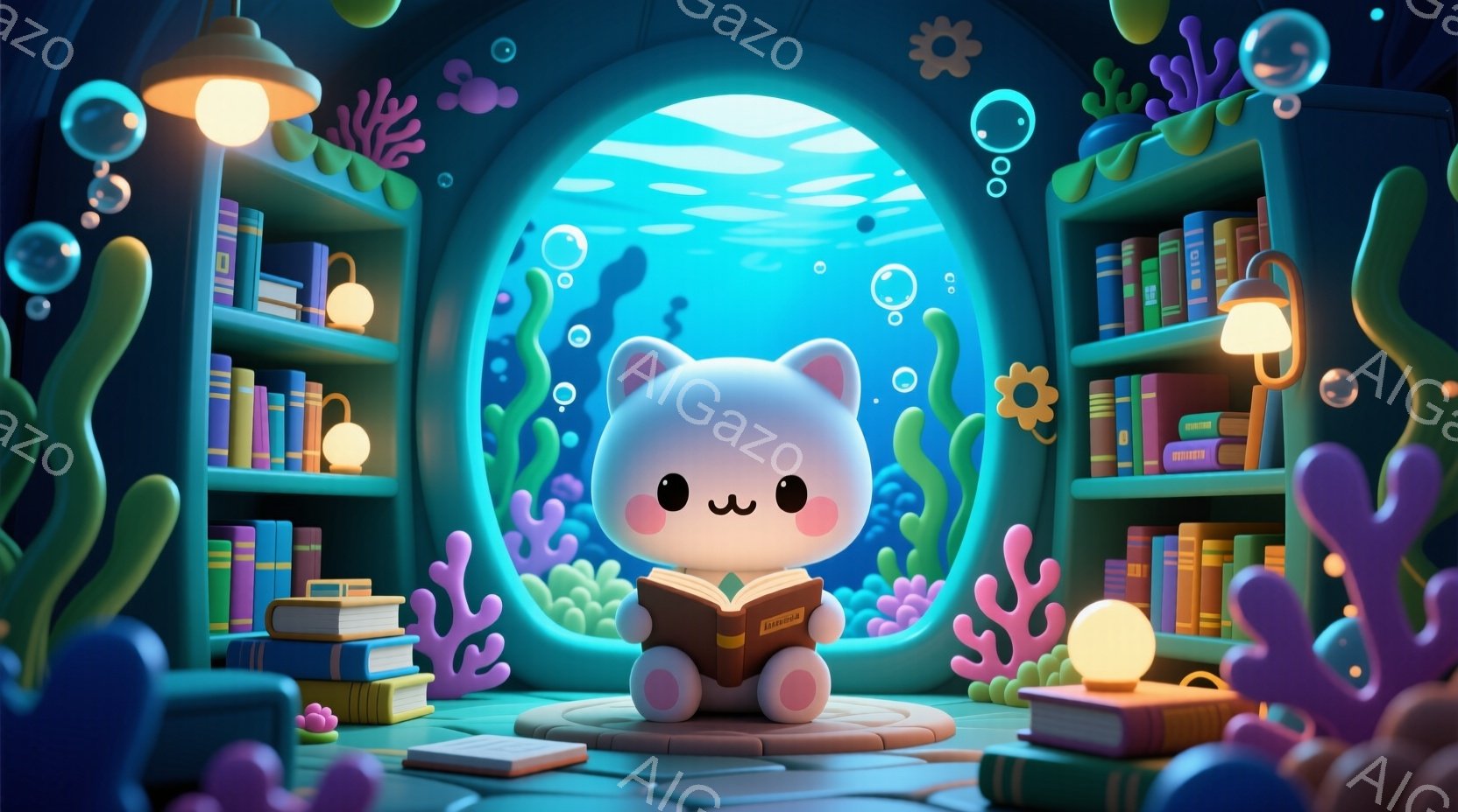 デジタルアート風の描写で、主要な人物がハイキャットと名乗り、犬のような身長に大きな眼鏡をかけている。彼らは、深海の世界に浮上した、おもちゃ箱の中に座っています。周囲には本が詰まったシェルが見え、深海生物が泳ぎ回っています。全体として、奇妙で夢のような雰囲気が漂っています。