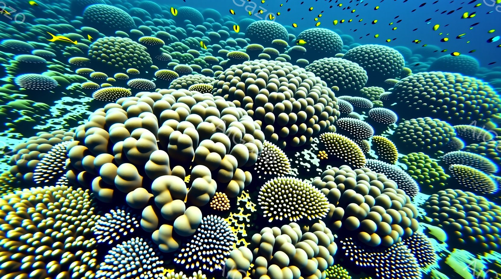 鮮やかな青色の水中を捉えたもので、様々なサイズのサンゴが密集して広がっています。サンゴは白と黒のストライプ模様を持ち、まるで小さな塔のように密集し、水中で光を反射しています。全体として、サンゴ礁の神秘的で活気ある雰囲気を伝えています。