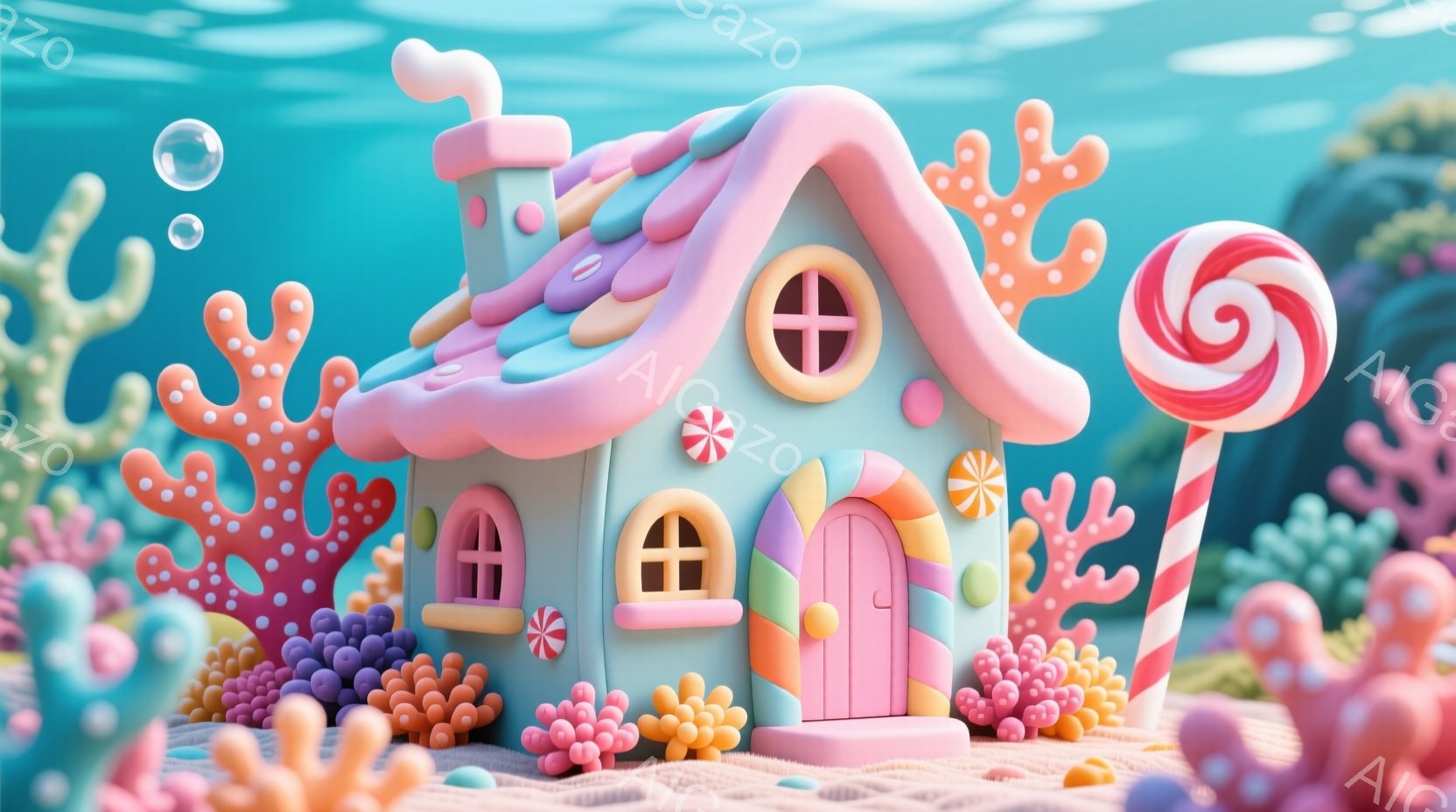カラフルなキャンディのような家が、珊瑚礁のような背景の中にあります。家はパステルグリーンの壁とピンクの屋根で、キャンディが飾りとしてあちこちに付いています。全体的に明るく、夢のような、おとぎ話のような雰囲気です。