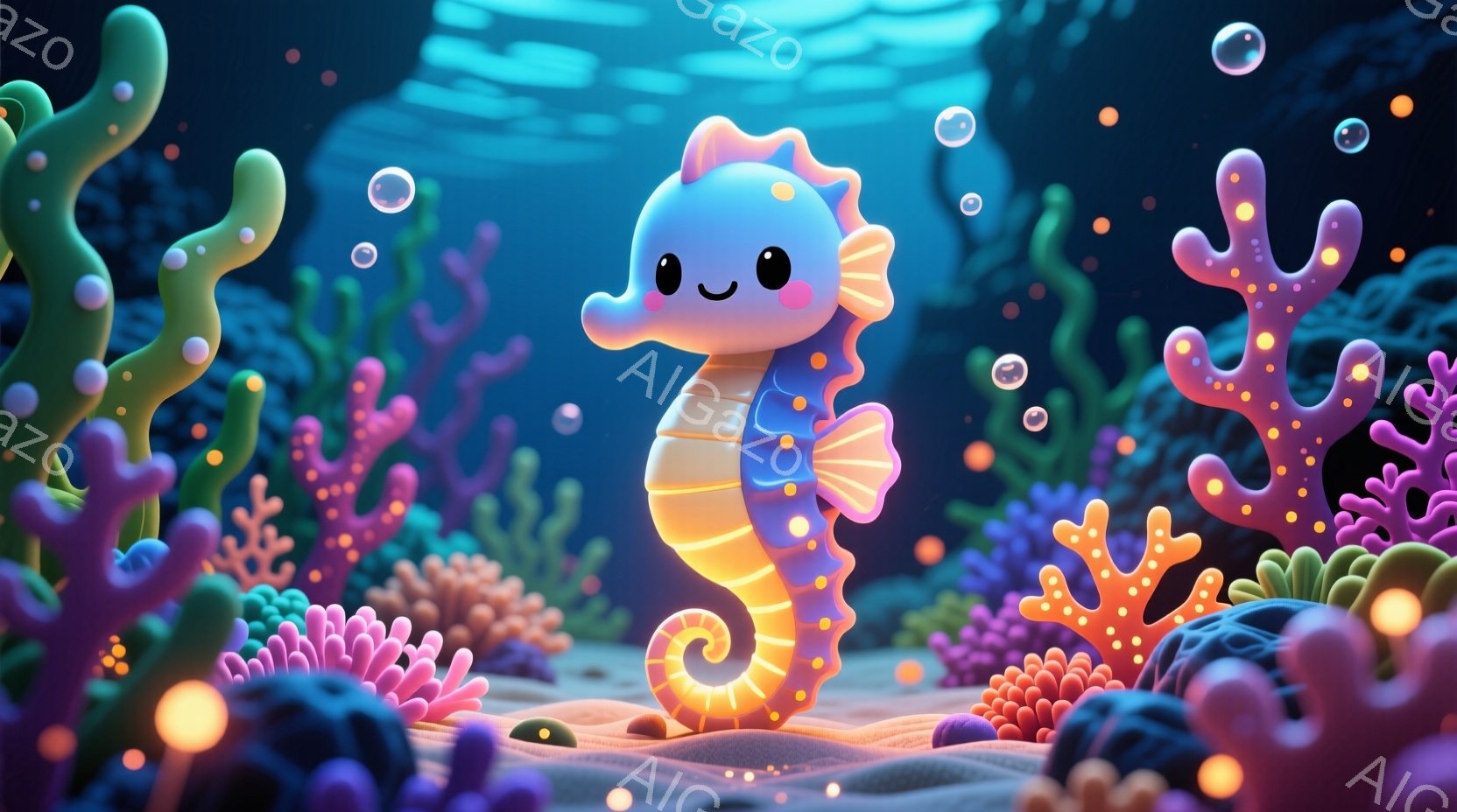 明るいピンクとオレンジ色のタツノオトシゴが、珊瑚礁の中にいる様子が描かれています。愛らしい表情と丸みを帯びた体型で、ピンク色の背びれとオレンジ色の縞模様が特徴的です。背景にはカラフルな珊瑚礁が広がり、水中に漂う泡が幻想的な雰囲気を醸し出しています。