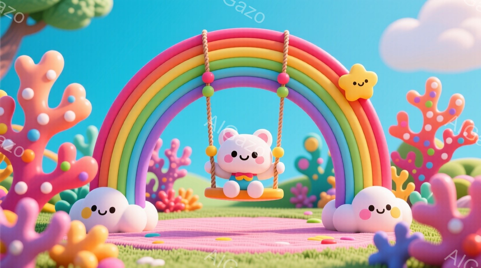 パステルカラーの可愛らしい世界を描いています。ピンク色のブランコに座った白いウサギは、オレンジ色のベストを着て、満面の笑みを浮かべています。背景には虹色のアーチ、泡のような植物、そして空にはふわふわとした雲が浮かび、全体的に夢のような、温かい雰囲気が漂っています。