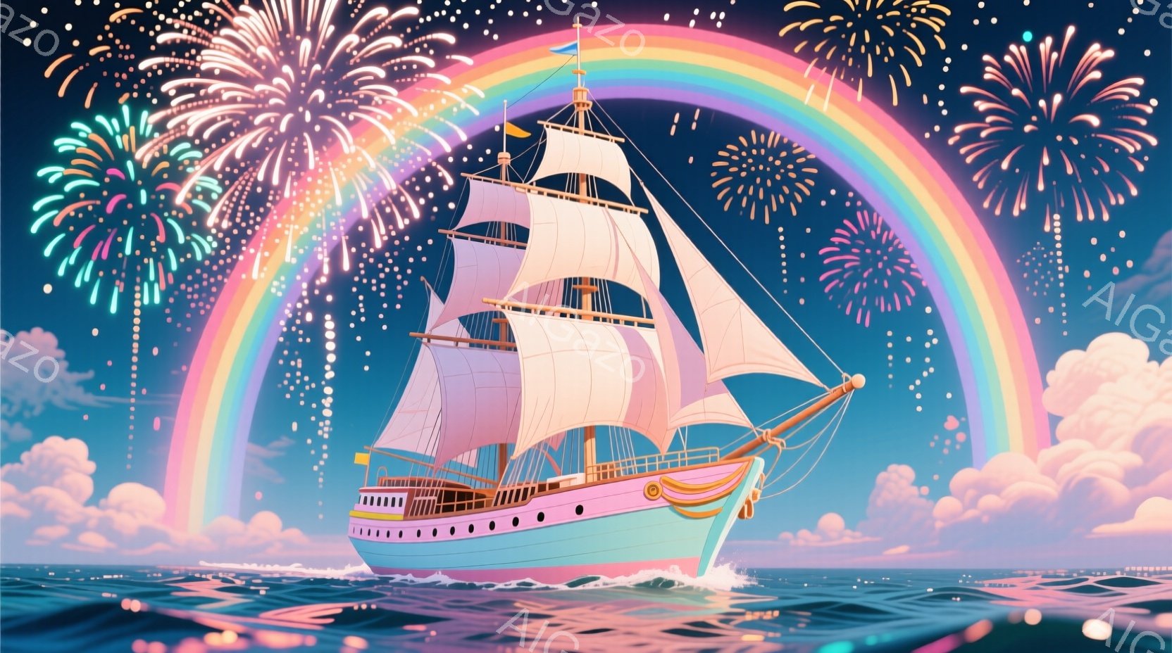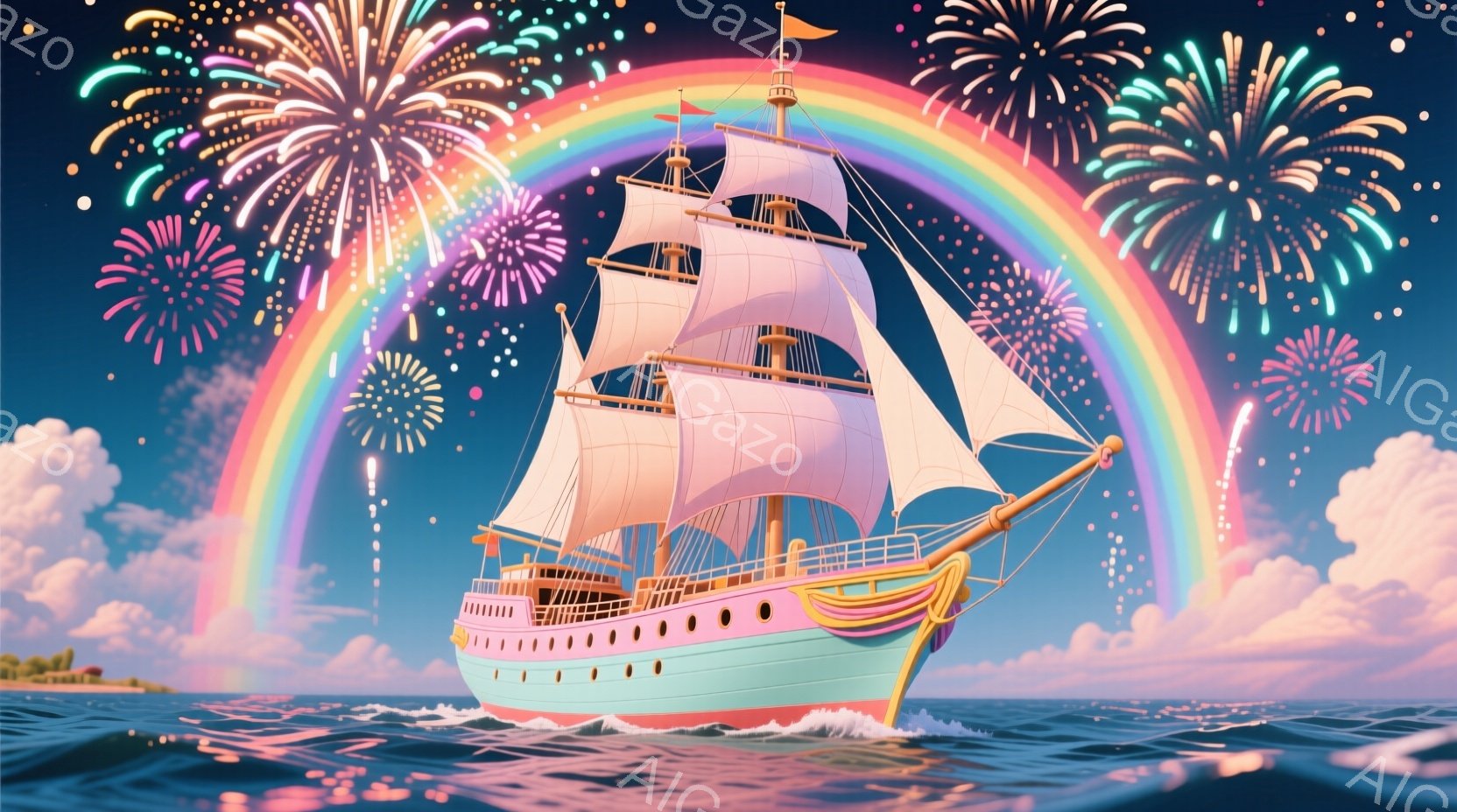 美しい帆船が、虹と花火が輝く穏やかな海を航行している様子が描かれています。船体は淡い水色で、帆は白く、きらめく波と鮮やかな空が背景に広がっています。全体的に夢幻的で平和な雰囲気が漂い、希望と冒険を感じさせます。