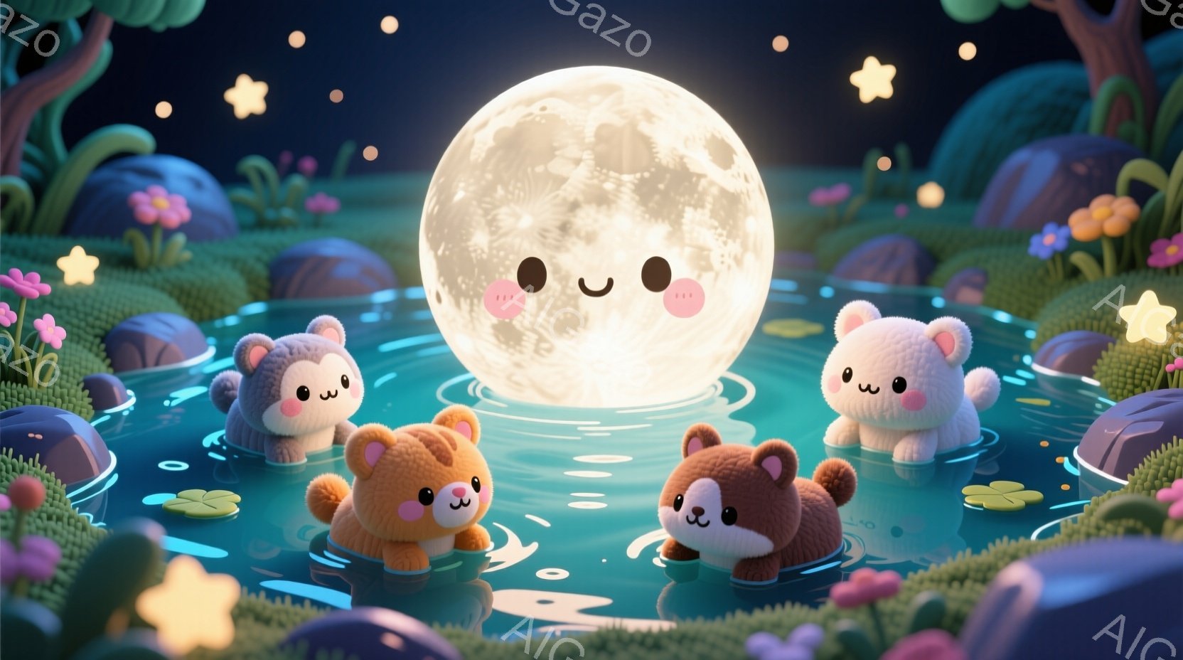 この無料AI生成画像「夜の森を舞台に、かわいらしい動物たちが泡風呂に入っている様子が描かれています。動物たちはそれぞれピンク、茶色、灰色、白の毛並みで、頭に小さな帽子をかぶり、楽しそうに微笑んでいます。背景には、月の光が差し込む緑豊かな森、水面を照らす月、そしてキラキラと輝く星空が広がり、温かく幻想的な雰囲気を醸し出しています。」は、2025年10月23日に作成されました。 サイズは 1664×928px の高解像度で、商用利用も可能なフリー素材として提供しています。