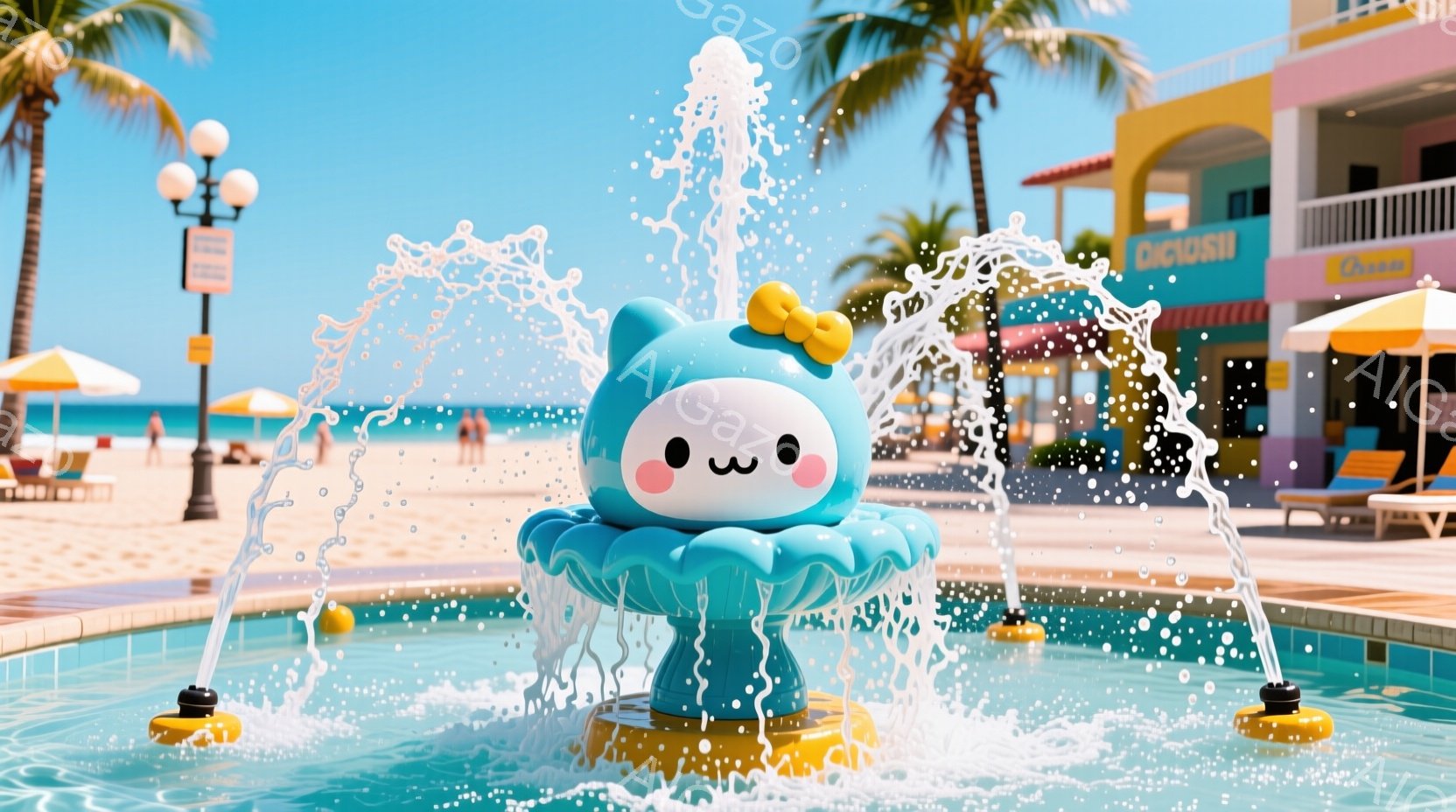 カラフルな噴水の中に、かわいらしい白い動物のキャラクターが座っています。背景には青い空とヤシの木、そしてビーチとカラフルな建物が見え、暖かい夏の日のリラックスした雰囲気が漂っています。噴水の水がキャラクターを取り囲み、楽しげな雰囲気をさらに高めています。