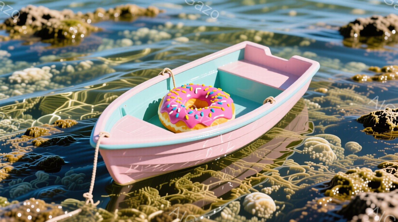 ピンク色の小さなボートが水面に浮かんでおり、中に鮮やかなピンク色のドーナツが置かれています。背景には海藻のような緑色の植物が密集し、水面は太陽の光でキラキラと輝いています。全体的に、遊び心があり、かわいらしい雰囲気が漂っています。