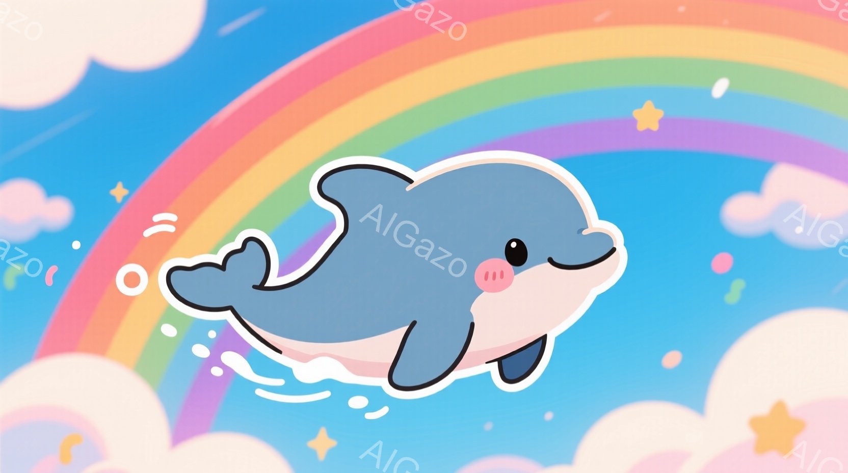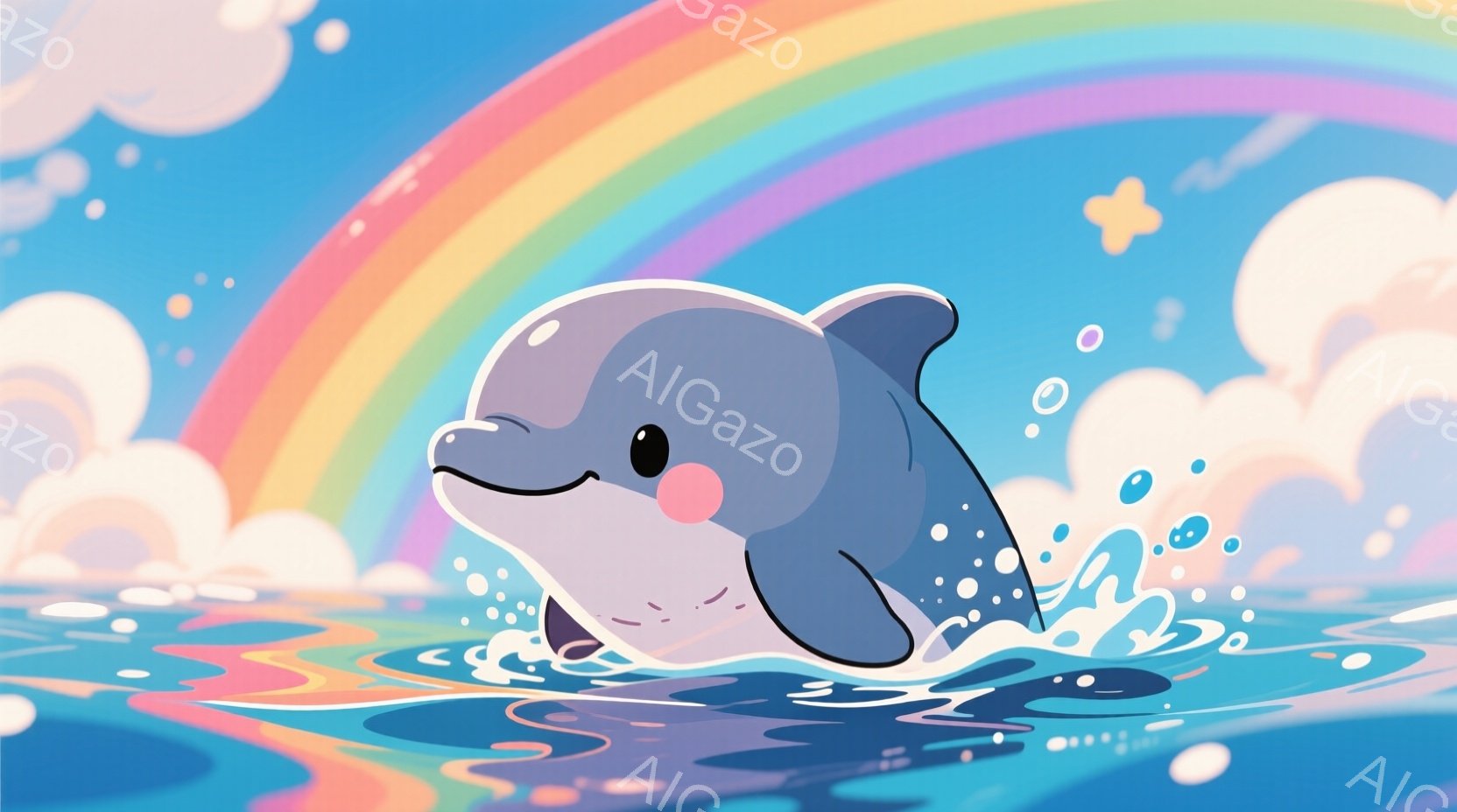 鮮やかな虹と波が広がる海を、愛らしいイルカが飛び跳ねています。イルカは笑顔で、丸みを帯びたフォルムが可愛らしさを強調しています。背景にはふわふわとした雲と星が散りばめられ、穏やかで夢幻的な雰囲気を醸し出しています。