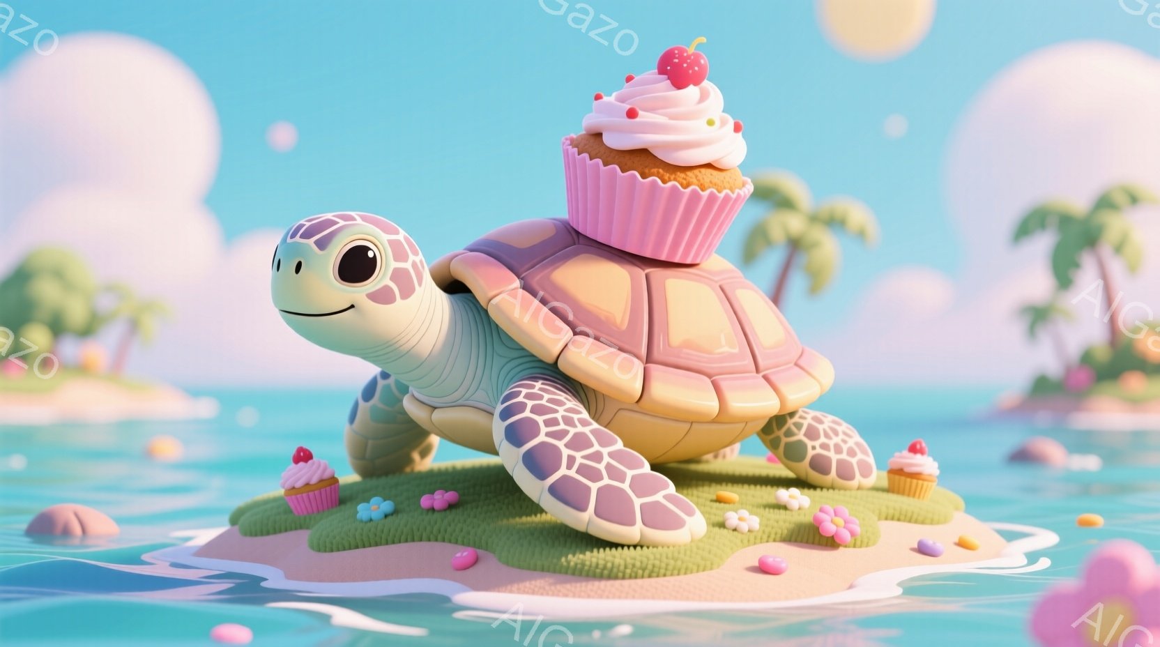 背中に大きなカップケーキを乗せた愛らしいカメを描いています。カメは水面を泳いでおり、その表情は穏やかで、まるでカップケーキを大切に運んでいるかのようです。背景には、青い海、ピンクの花、そしてヤシの木が生い茂る熱帯の島があり、暖かい日差しが降り注いでいます。
