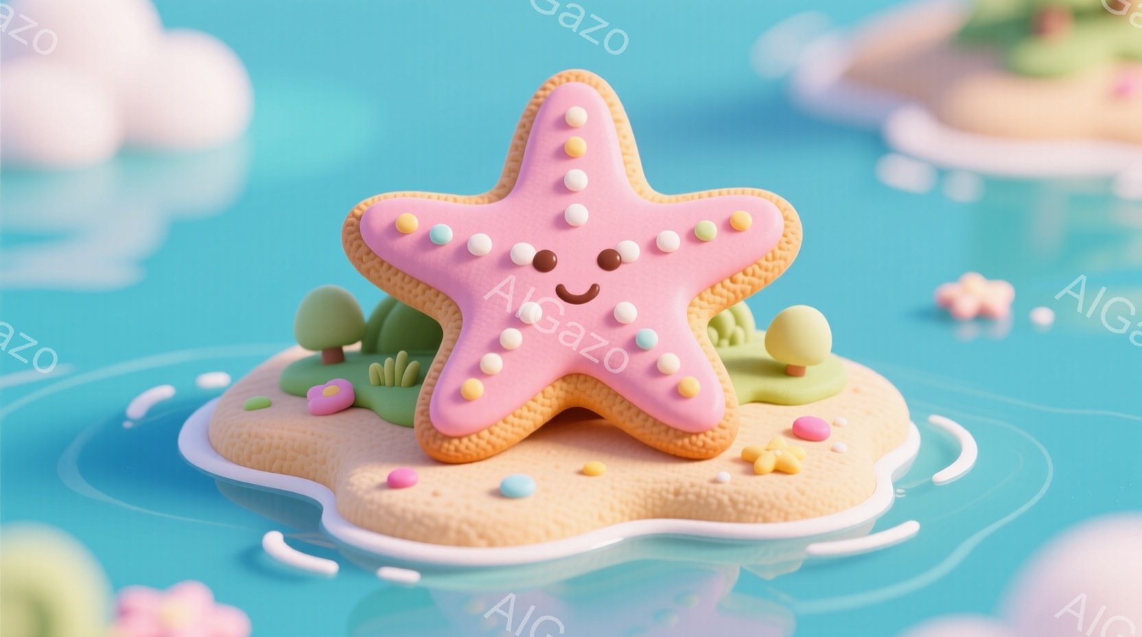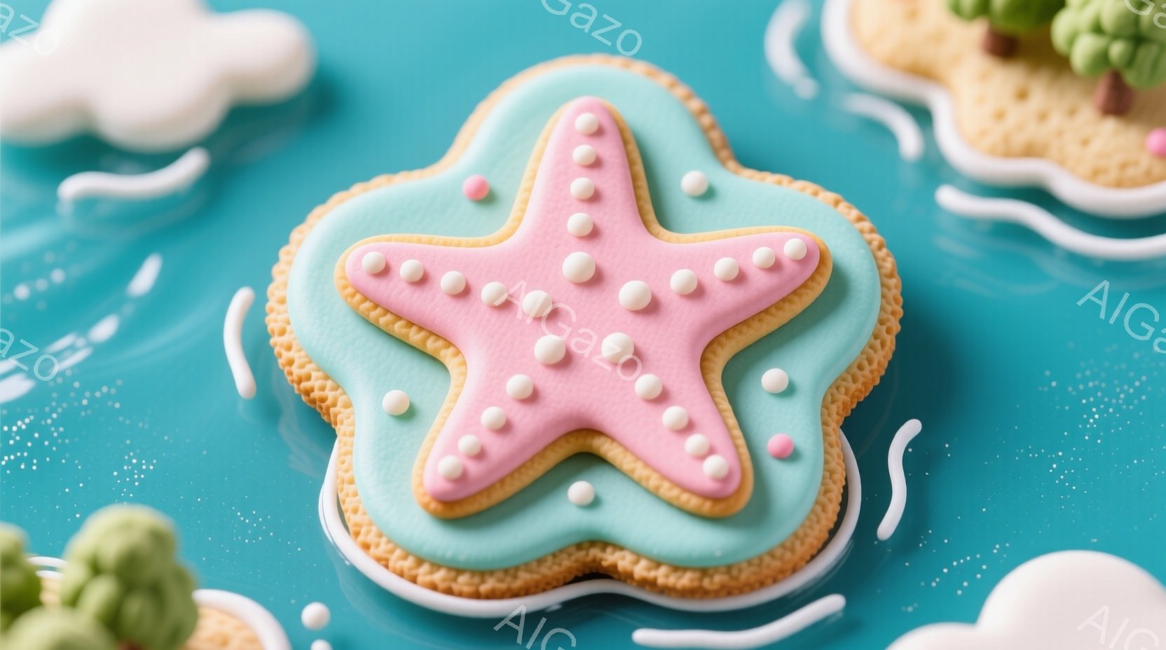 この無料AI生成画像「明るい水色の背景に、ピンクと水色のアイシングでデコレーションされた星形のクッキーが中央に配置されています。クッキーの縁は茶色く、水色のアイシングで囲まれ、ピンクのアイシングで星形が描かれています。背景には、他のクッキーや小さな貝殻のような飾りがあり、全体的に海洋をテーマにしたお菓子の写真です。」は、2025年10月23日に作成されました。 サイズは 1664×928px の高解像度で、商用利用も可能なフリー素材として提供しています。