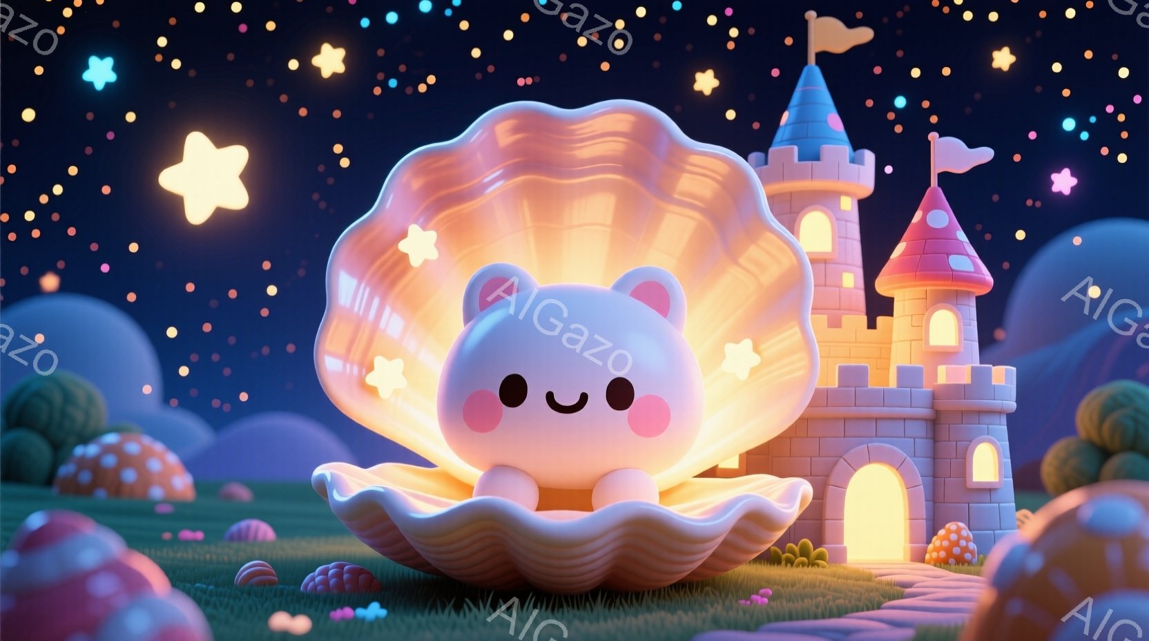貝殻のような台座の上に、かわいらしいピンク色の城が建っています。城は丸みを帯びたデザインで、窓からは優しい光が漏れており、まるで妖精が住んでいるような雰囲気です。背景には、パステルカラーの丘や星が散りばめられており、ファンタジーの世界観を演出しています。