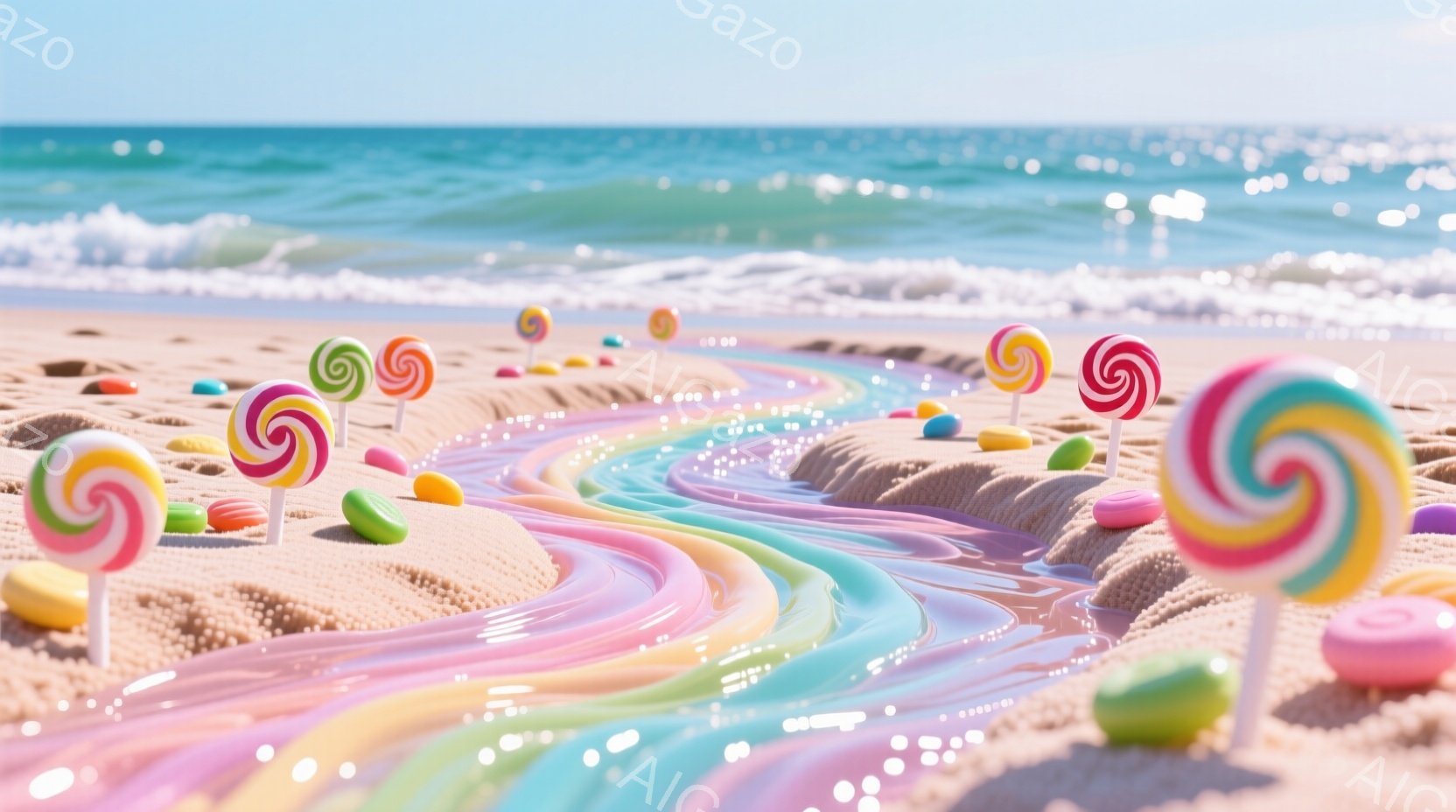 砂浜に虹色のキャンディが流れるような奇妙な光景が広がっている。キャンディは渦巻き状の棒付きキャンディや小さな粒状のキャンディで構成され、まるで道のように砂浜を蛇行している。背景には穏やかな青い海と、明るい晴天が広がり、幻想的で遊び心のある雰囲気を醸し出している。