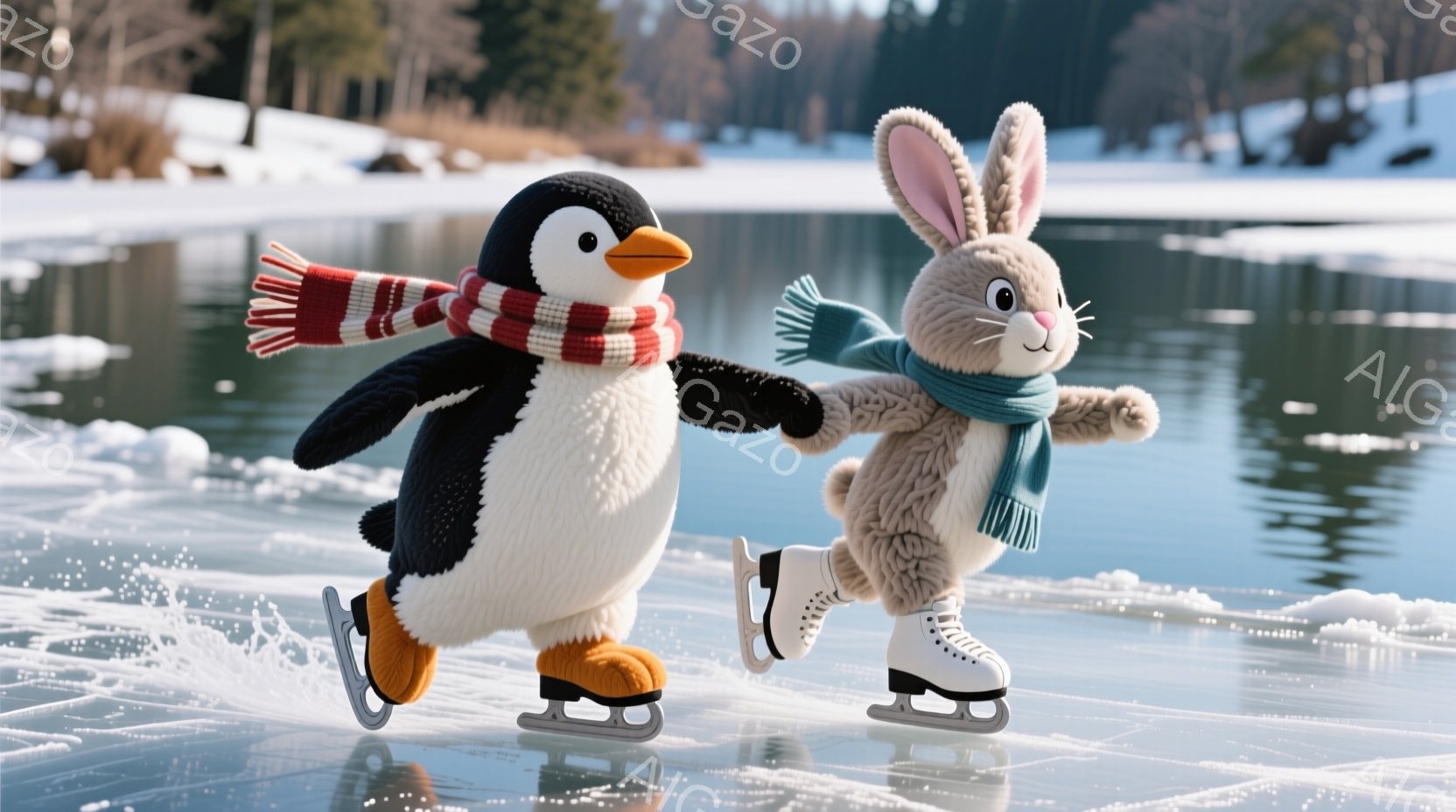 ペンギンとウサギが凍った湖の上でスケートを楽しんでいます。ペンギンはカラフルなストライプのセーターとマフラーを身につけ、ウサギは緑色のマフラーを巻いています。背景には雪の積もった木々と、遠くにぼんやりと見える建物があり、冬の晴れた日の穏やかな雰囲気が漂っています。