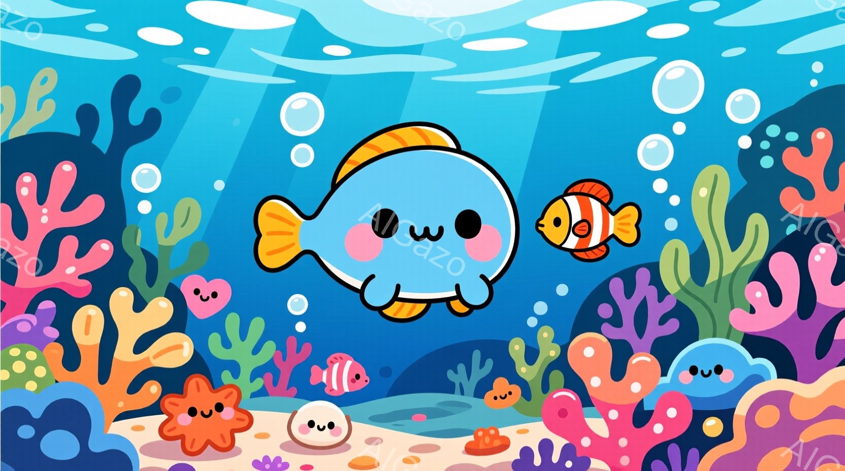 この無料AI生成画像「明るい青色の海底を背景に、かわいらしい猫のようなキャラクターが立っています。淡い水色のセーターに黄色いリボン、そして同じ色の短いズボンを身に着け、つぶらな瞳と控えめな笑顔が愛らしい印象を与えます。周囲にはオレンジやピンクのサンゴ礁が配置され、小さな熱帯魚が泳ぎ、穏やかで幻想的な雰囲気を醸し出しています。」は、2025年10月23日に作成されました。 サイズは 1664×928px の高解像度で、商用利用も可能なフリー素材として提供しています。